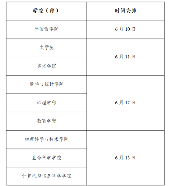 6月10日(星期二)至14日(星期六),6月16日(星期一)至20日(星期五)8:00—11:30,具体时间安排见下表: