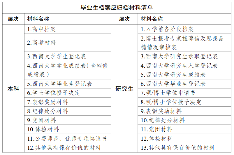 (2)正式入职本校(含博士后)的毕业生档案,由培养单位列出《西南大学教职工(含博士后)档案移交清单》(附件5),将密封完好的档案和移交清单交档案馆教职工档案室(档案馆101室);