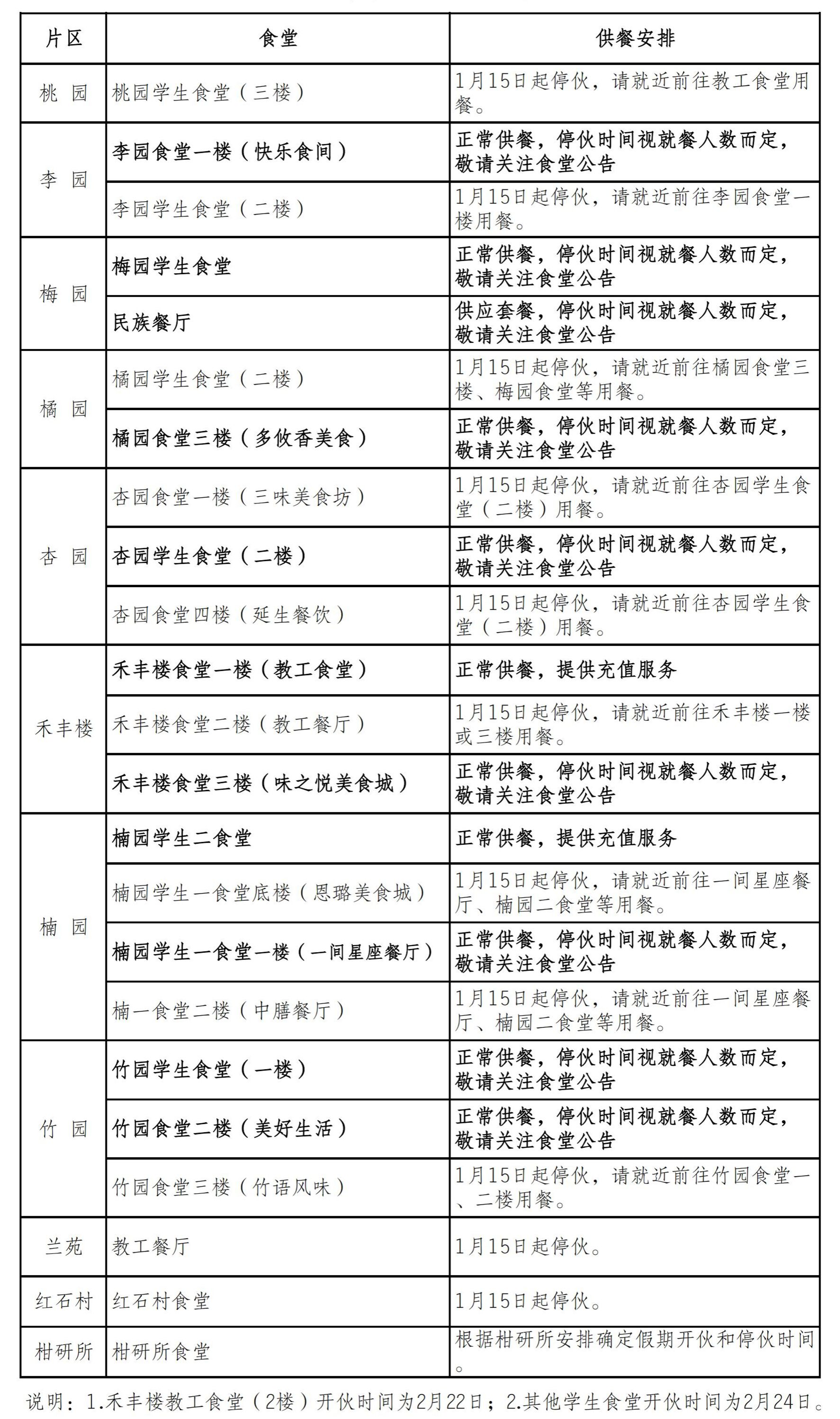 1.1月20日(星期六)至 2月20日(星期二)期间,根据宿舍在寝人数调整供水频次,假期将对澡水设施设备进行全面检修和维护,届时部分楼栋可能会短时间停供,具体安排见各值班室通知。2月21日(星期三)起恢复正常供水。