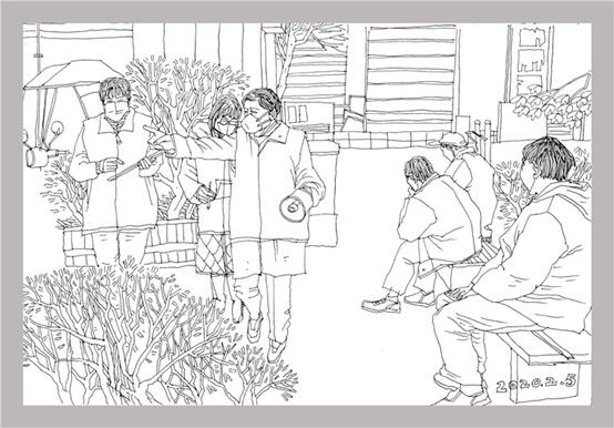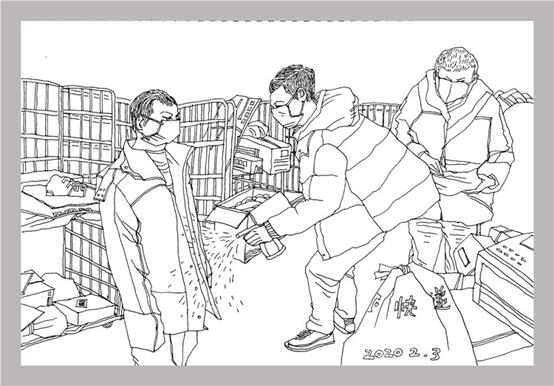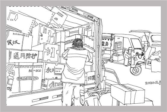 《小区门口便利店》:平时都是低头不见抬头见的街坊邻居,现在虽然戴了口罩、保持距离,但心意却是相通的。