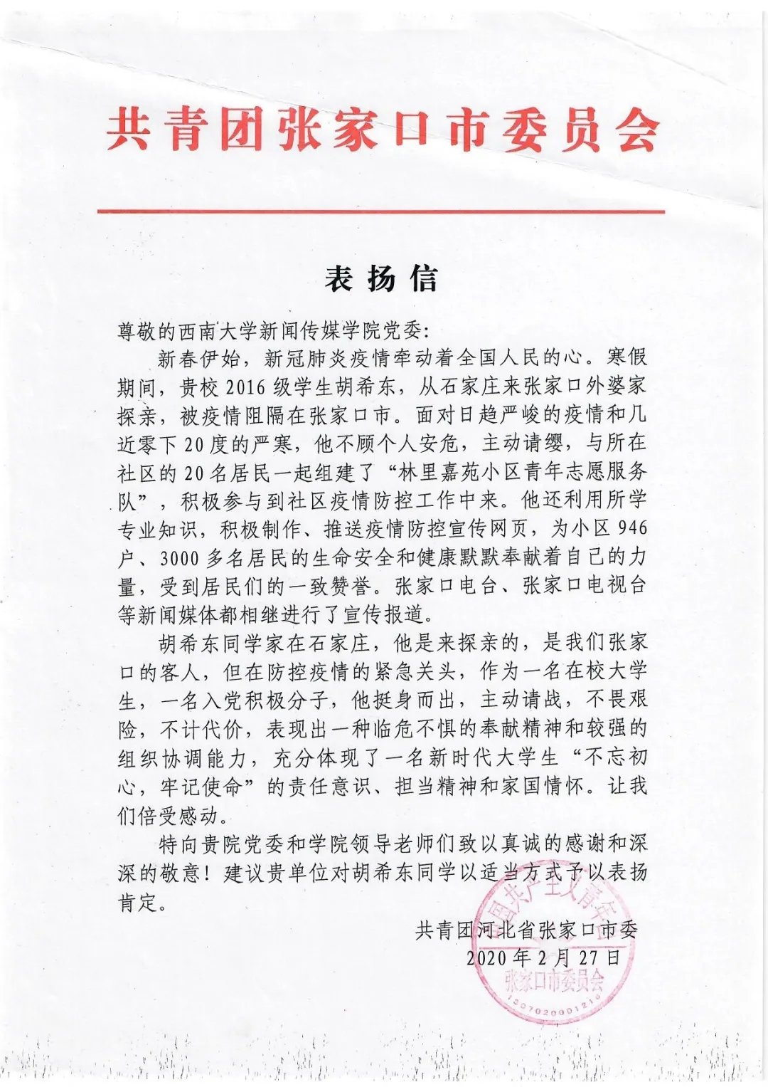 西南大学新闻传媒学院2016级本科生胡希东参与组建了张家口市第一支由居民自发组建的志愿者服务队。在该志愿服务队的带领下,张家口市其他小区也积极行动起来,陆续组建起自己小区的居民志愿服务队,广泛凝聚了张家口市社区防疫工作力量。对此,河北省张家口市委专门寄来了表扬信。