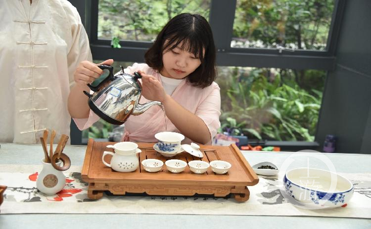 此外,茶艺表演、DIY线装书活动也吸引了在场同学的关注。身着传统长衫的茶艺师耐心地科普何为“品茗杯”、何为“温杯洁具”、如何鉴赏甘茶等专业茶艺知识。
