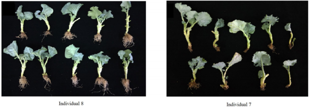 甘蓝类蔬菜包含结球甘蓝、花椰菜、青花菜、苤蓝、孢子甘蓝和芥蓝等不同变种,表型差异十分丰富。目前,Ogura CMS不育系已经成为甘蓝类蔬菜杂种优势利用最普遍的育种途径。Ogura CMS细胞质雄性不育基因位于细胞质内,位于不育材料(品种)中的优异性状无法被分离出来与其他优异性状进行组合而被再利用,形成优异种质资源再利用的技术封锁,阻碍甘蓝类蔬菜优异育种材料的创新。为了突破Ogura CMS不育系的技术封锁,研究所将来自萝卜的RfoB恢复基因优化后转入结球甘蓝中,创制了结球甘蓝Ogura CMS恢复系(图1),将该恢复系与不同类型的甘蓝类蔬菜杂交和回交创制了一系列(18种类型)甘蓝类蔬菜Ogura CMS专用恢复系(图2),并利用该恢复系成功转出了Ogura CMS品种GZ87的根肿病抗性(图3)。