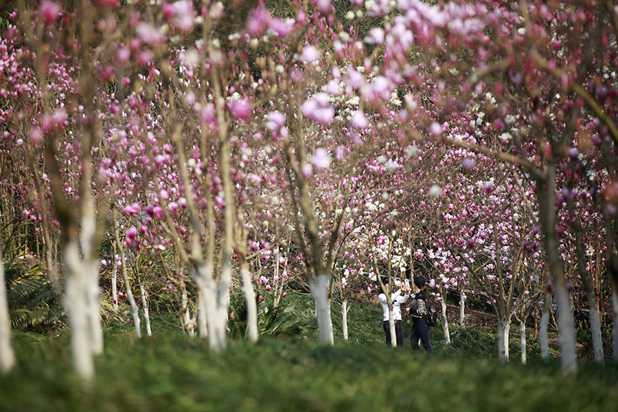 近日,重庆天气晴好,阳光充足,主城繁花似锦。西南大学的花海也不约而同地怒放,特别是玉兰花,红白相间,分外妖娆,引得众多市民前来打卡。(胡虹、袁杰)