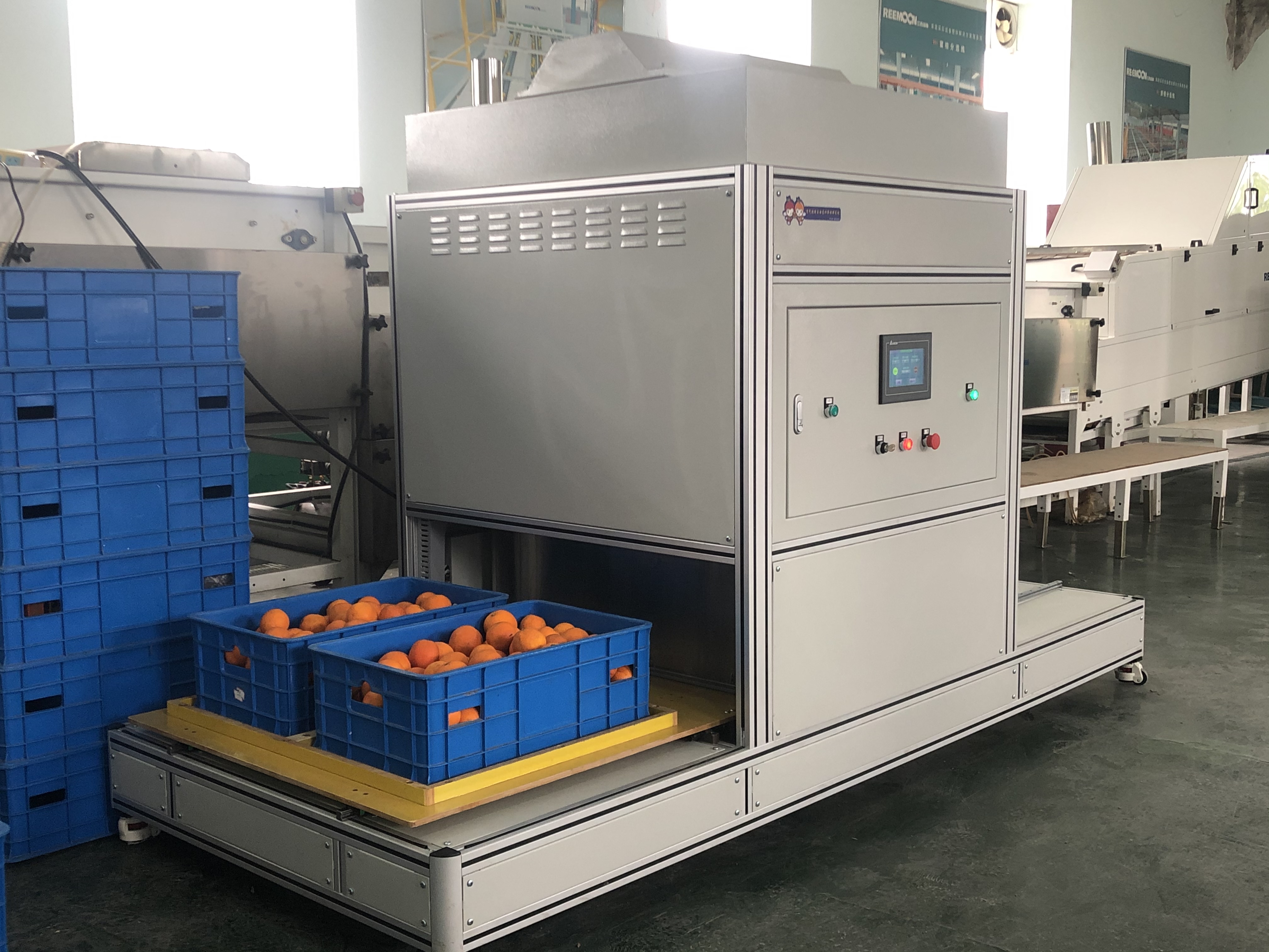 记者在西南大学柑桔研究所的实验室看到,工作人员只需将一筐筐柑橘送入“水果物理防腐保鲜机”,无需添加任何东西,设备就会按照预先设定的时长进行杀菌。