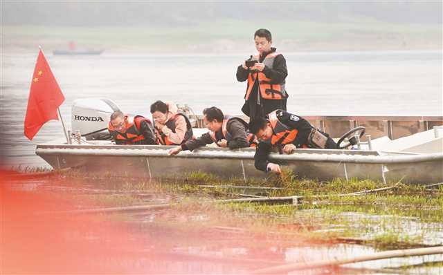 “看,这根水草上有好多鱼卵……再往前靠一点,我拍几张照片回去存档。”5月29日,长江上游珍稀特有鱼类国家级自然保护区江津段古家沱鱼类产卵场,西南大学水产学院科研队员们划着小船,老师张春霖在船上操控着水下无人机,观察鱼在水草上的产卵情况。