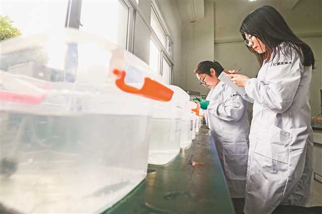 西南大学水产学院渔业资源与保护学实验室,科研人员查看鱼苗生长情况。