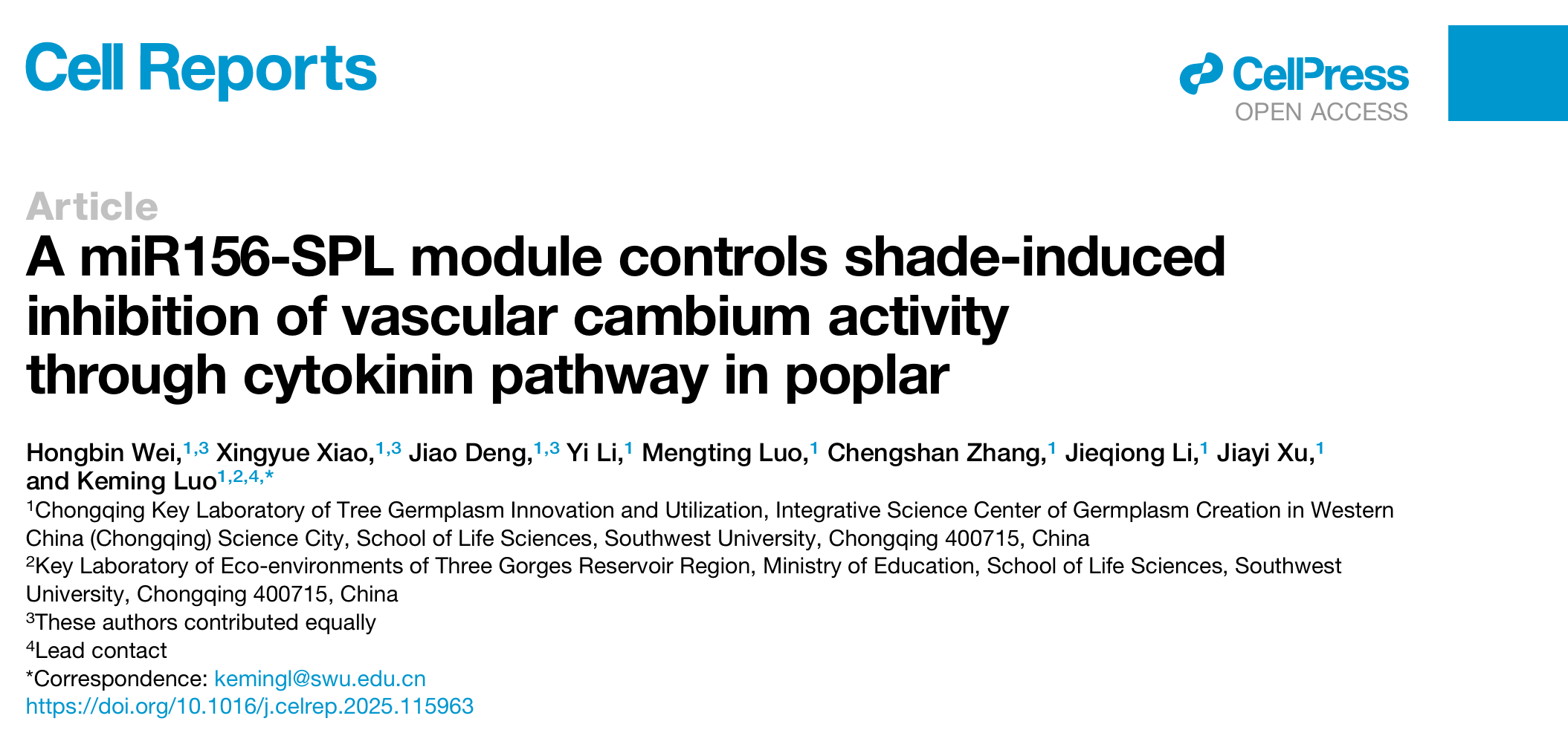 近日,生命科学学院罗克明教授、魏洪彬副教授团队在细胞出版社旗下期刊《细胞-报告》(Cell Reports)在线发表了题为《一个miR156-SPL模块通过细胞分裂素途径介导遮荫对杨树维管形成层活性的抑制作用》(A miR156-SPL module controls shade-induced inhibition of vascular cambium activity through cytokinin pathway in poplar)的研究论文,揭示了遮荫通过miR156-SPL16/23-细胞分裂素信号通路抑制杨树茎中形成层活性和木质部发育,为耐荫树种的遗传改良提供重要靶标。