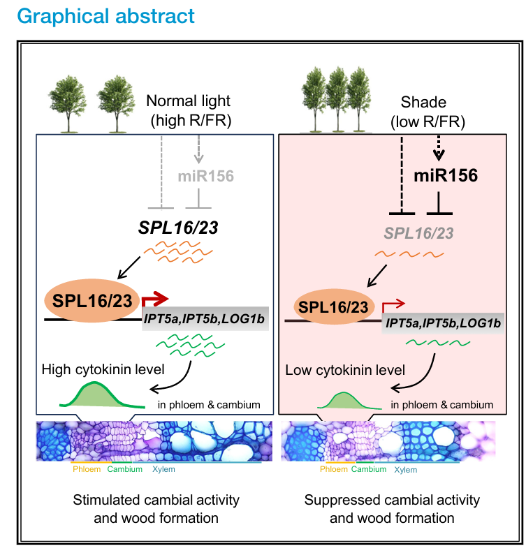 本研究通过天然林分密度梯度与人工模拟遮荫实验相结合,系统解析了遮荫(低R/FR比值)对毛白杨形成层活性和次生木质部发育的影响。结果显示,模拟遮荫导致茎韧皮部和形成层中miR156水平显著升高,其靶基因SPL16和SPL23的转录水平显著下调,进而抑制了形成层细胞的分裂与分化。此外,遮荫通过抑制杨树茎中细胞分裂素(CK)生物合成关键基因IPT5a、IPT5b和LOG1b的表达,降低了活性CK的含量水平。功能验证表明,在韧皮部中特异表达SPL16或CK合成基因(IPT5b和LOG1b)能促进形成层活动,并有效抵消遮荫对细胞增殖和木质部发育的抑制作用。进一步的分子遗传分析证实,SPL16/23蛋白直接结合并激活IPT5a/IPT5b/LOG1b表达,增强CK合成,从而促进形成层增殖与分化过程。综上,本研究首次从 miR156 SPL16/23 IPT5/LOG1 CK 信号级联通路层面,完整解析了遮荫信号负向调控树木形成层活性与次生木质部发育的分子机制。