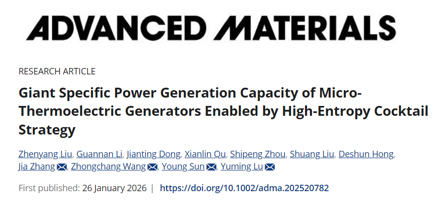 日前,西南大学、华中科技大学及重庆大学的研究团队协同攻关,在面向微型热电发电机的新材料研发领域取得重要进展。研究团队采用“高熵鸡尾酒策略”,成功制备出基于FeCoNi-Pt磁性中熵合金薄膜的微型热电发电机,其比功率发电容量达到约5000μW cm-2 K-2,较此前报道的最高值提升超过一个数量级。相关成果以《通过高熵鸡尾酒策略成功构筑巨比功率发电容量的微型热电发电机》(Giant Specific Power Generation Capacity of Micro-Thermoelectric Generators Enabled by High-Entropy Cocktail Strategy)为题发表于材料科学领域顶级期刊《先进材料》(Advanced Materials)。
