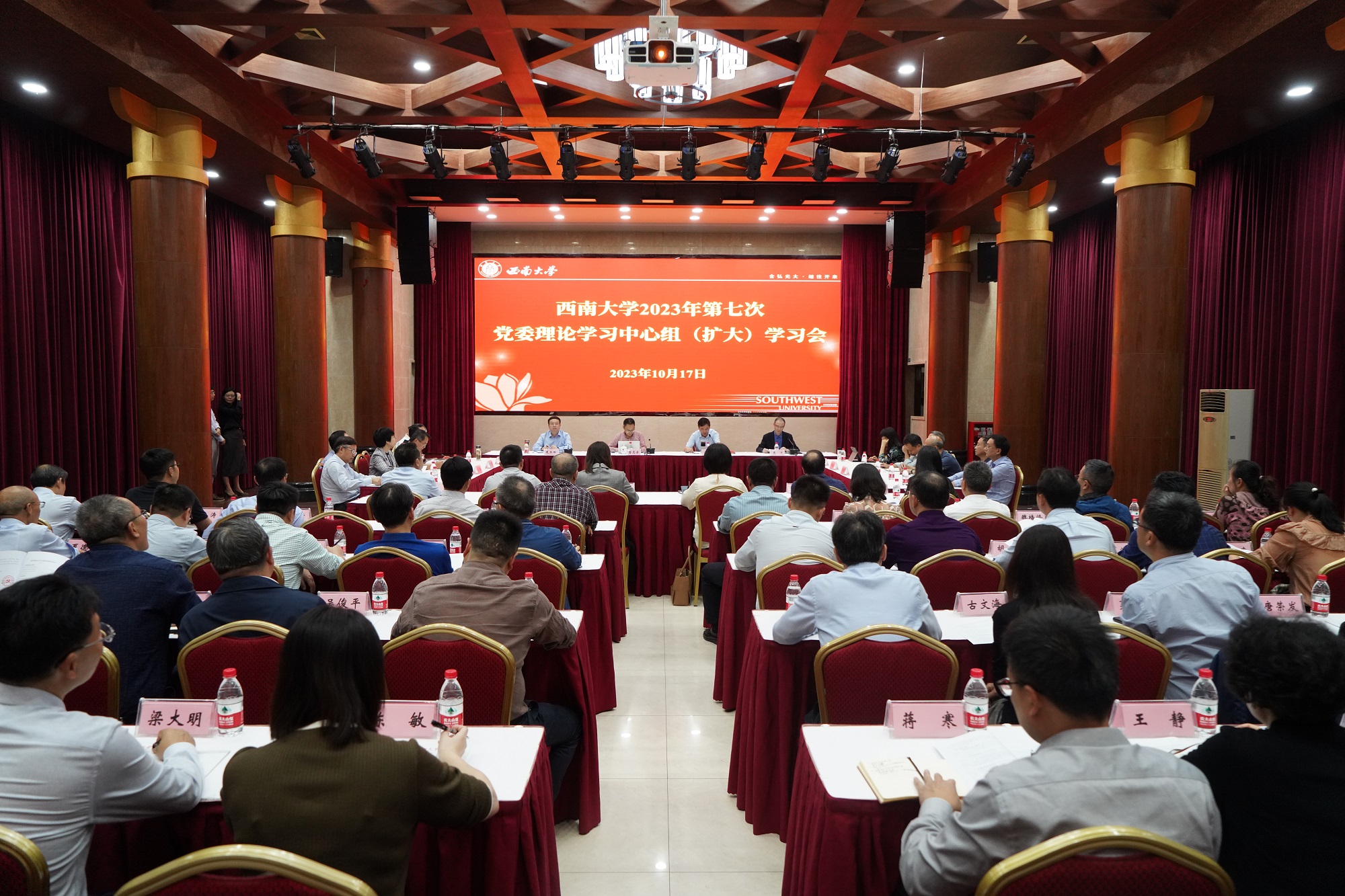 10月17日,学校在东方红会议厅召开2023年第七次党委理论学习中心组(扩大)学习会,校领导、党委常委、党委委员、纪委委员、党群部门主要负责人、二级党组织书记参加会议。会议由党委副书记潘洵主持。