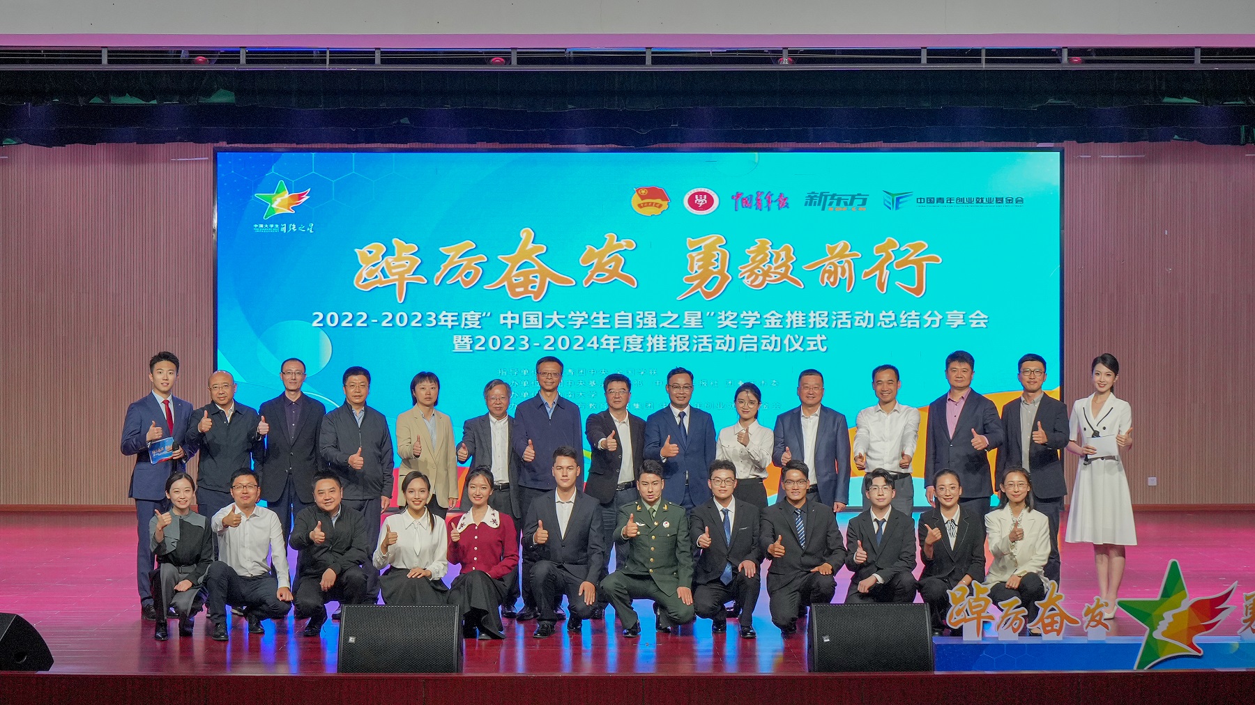 10月24日,2022-2023年度“中国大学生自强之星”奖学金推报活动总结分享会暨2023-2024年度推报活动启动仪式在西南大学举行。本次活动以“踔厉奋发 勇毅前行”为主题,学校陈玥瑚等10名“中国大学生自强之星标兵”奖学金获得者分享了他们的自强故事。团中央基层建设部副部长李辉,全国学联驻会执行主席吴霖霖,全国学联办主任潘昊,中国青年报社党委常委、副总编辑吴湘韩,中国青年报社运营中心主任乔建宾、副主任王毅旭,新东方教育科技集团公共事务副总裁王学文、公益基金会秘书长李晶瑶、重庆新东方学校校长温巍,中国青年创业就业基金会综合处处长黄丽东、共青团重庆市委副书记杨春渝,学校党委书记李旭锋、党委副书记黄杰等领导出席活动。