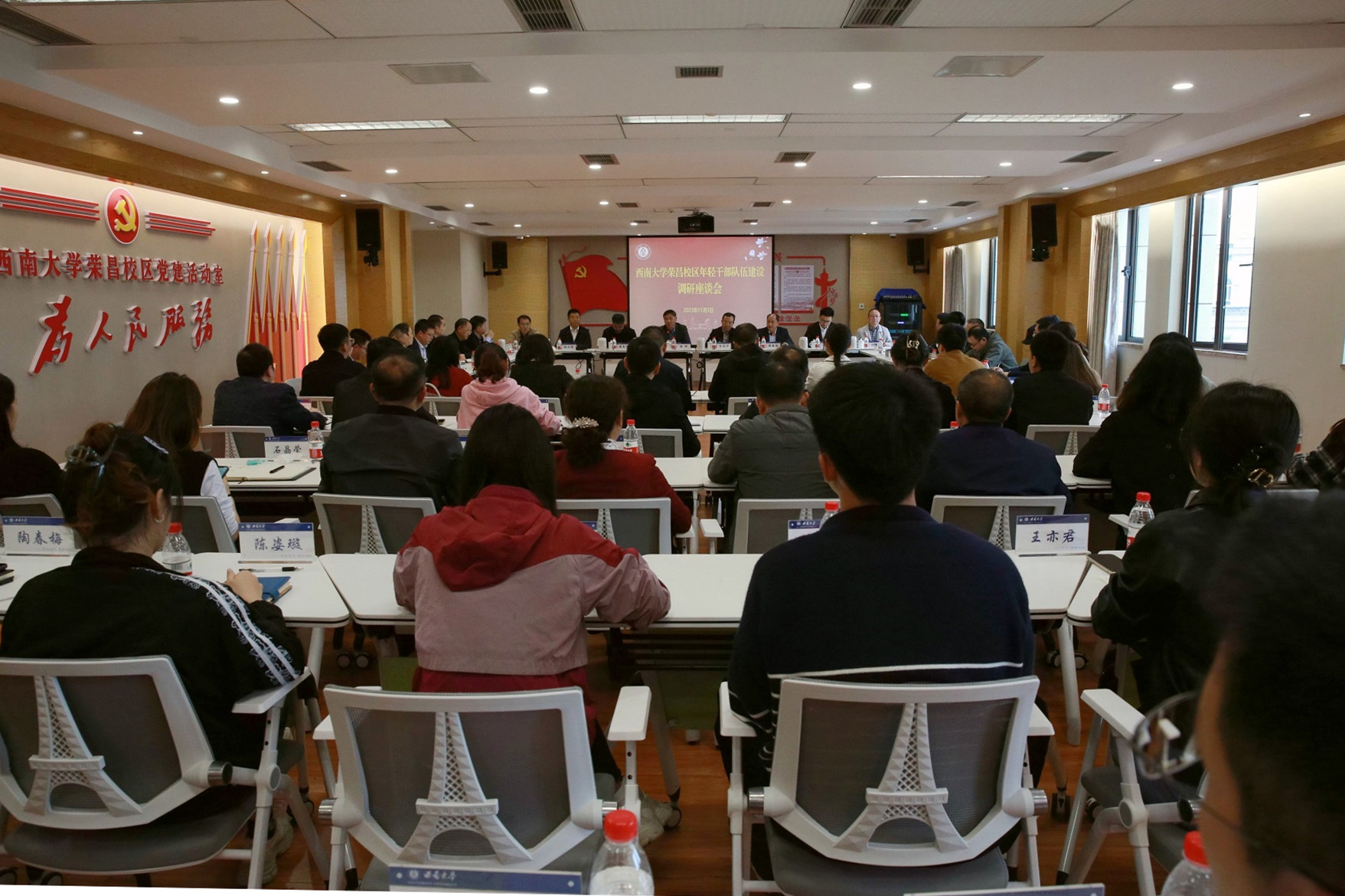 当日下午,潘洵一行出席荣昌校区年轻干部队伍建设调研座谈会,荣昌校区党工委、管委会负责同志,在荣四个学院党委书记,在荣机关和学院青年教师代表、全体正科级干部和辅导员参加座谈会,学校党委常委、组织部部长李荣华主持座谈会。会上,12位年轻同志围绕习近平总书记在学习贯彻党的二十大精神研讨班开班式上的重要指示精神谈感悟和体会,对学校健全培养选拔优秀年轻干部常态化工作机制提出建设性意见和建议。周国安介绍了在荣各单位干部的基本情况及干部培养工作思路和机制。