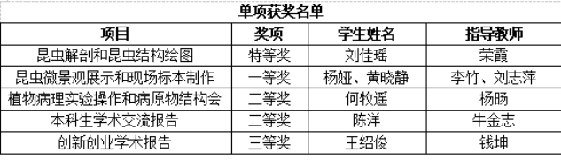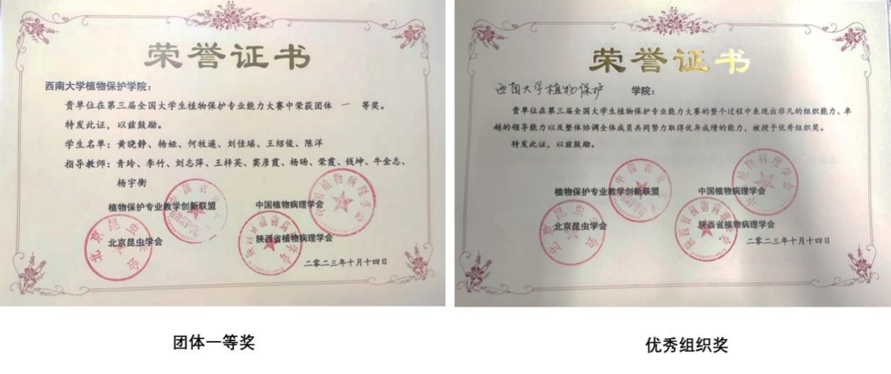 10月13日至15日,第三届全国大学生植物保护能力大赛在西北农林科技大学举行。此次比赛共设置了四个模块七个项目,西南大学植物保护学院青玲教授带队,共5名教师和6名学生参加比赛,荣获团体一等奖和优秀组织奖,并在昆虫解剖与绘图、昆虫微景观展示和现场标本制作等单项比赛中取得特等奖1项、一等奖1项、二等奖2项、三等奖1项的优异成绩。