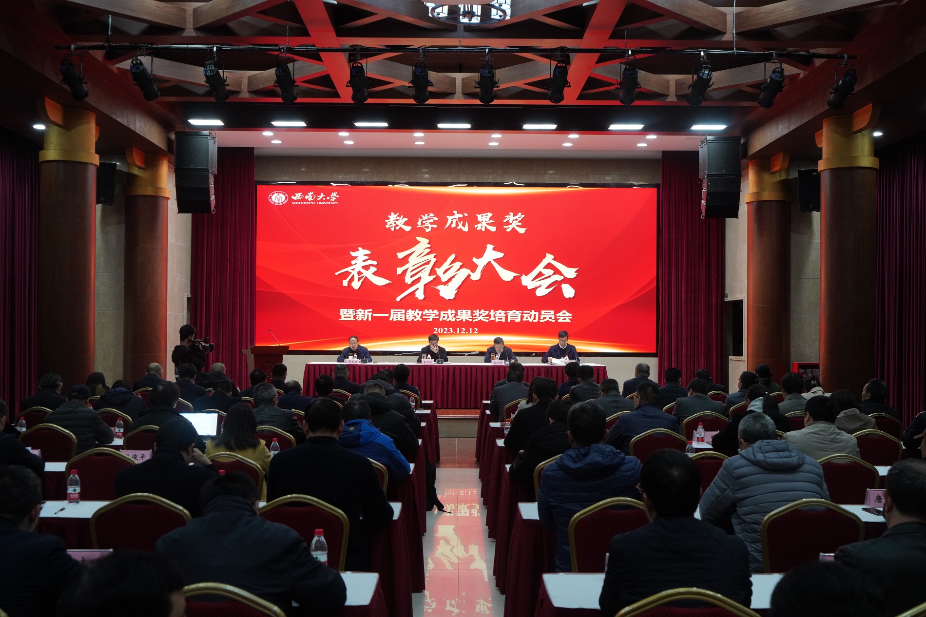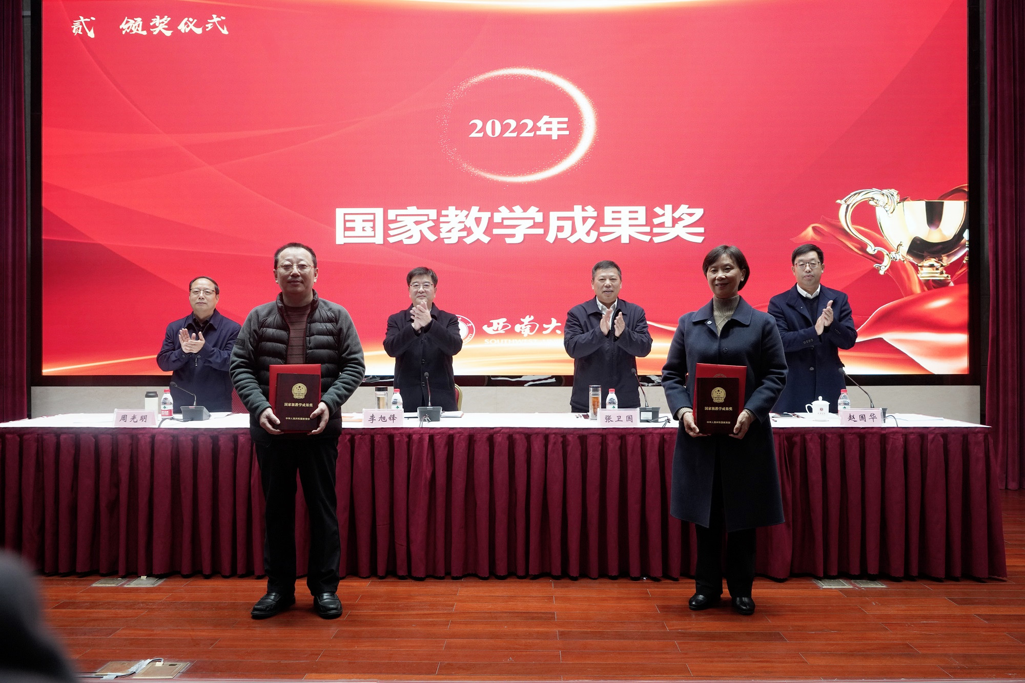 赵国华宣读《西南大学关于表彰省级以上教学成果奖的决定》,参会校领导为获得2022年国家教学成果奖、2021年重庆市教学成果奖特等奖及一等奖的团队代表颁奖。
