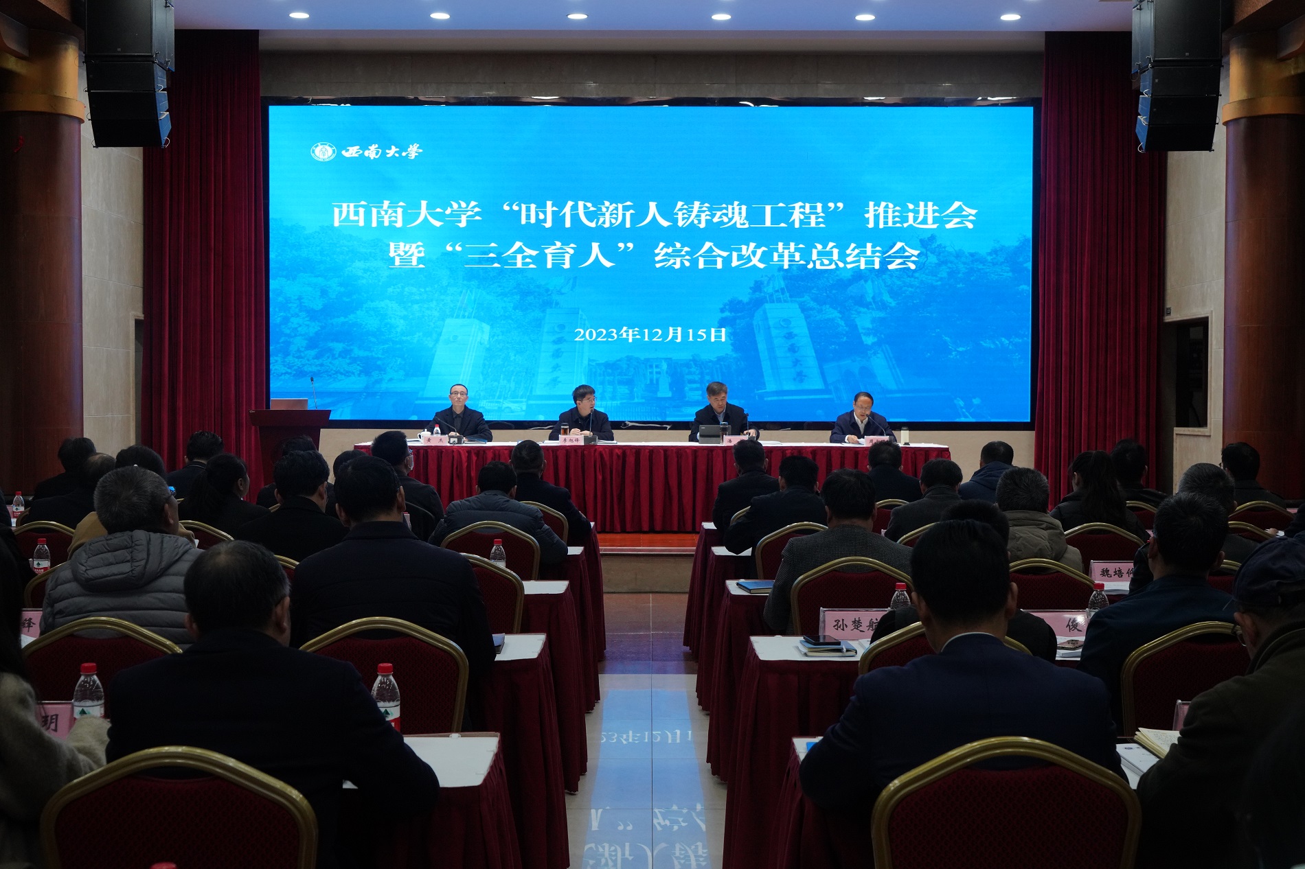 校党委副书记潘洵作“三全育人”综合改革工作总结,他指出,学校切实强化顶层设计,优化体制机制、明确责任清单、加强校院协同,进一步完善一体化育人体系;着力资源整合,聚焦关键群体、激发全员育人动力,聚焦关键环节、增强全过程育人合力,聚焦关键场域、优化全方位育人效力,进一步落实“三全育人”理念;突出特色品牌建设,全面推进“十大育人体系”,进一步打造精品示范项目,“三全育人”综合改革成效显著。