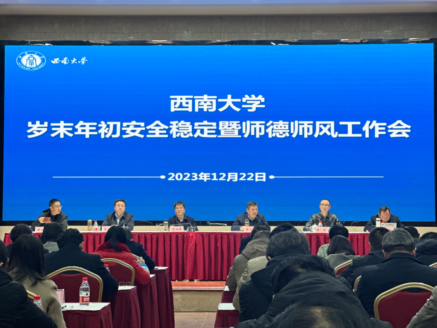 为深入贯彻落实习近平总书记关于安全生产的重要论述,落实市教委岁末年初全市校园安全稳定暨师德师风工作会议精神,统筹部署有关工作,确保学校安全稳定,12月22日下午,学校召开岁末年初安全稳定暨师德师风工作会,党委书记李旭锋,校长张卫国,党委副书记、纪委书记夏玉峰,党委副书记黄杰,副校长韩旭东、王志坚出席会议。黄杰主持会议。