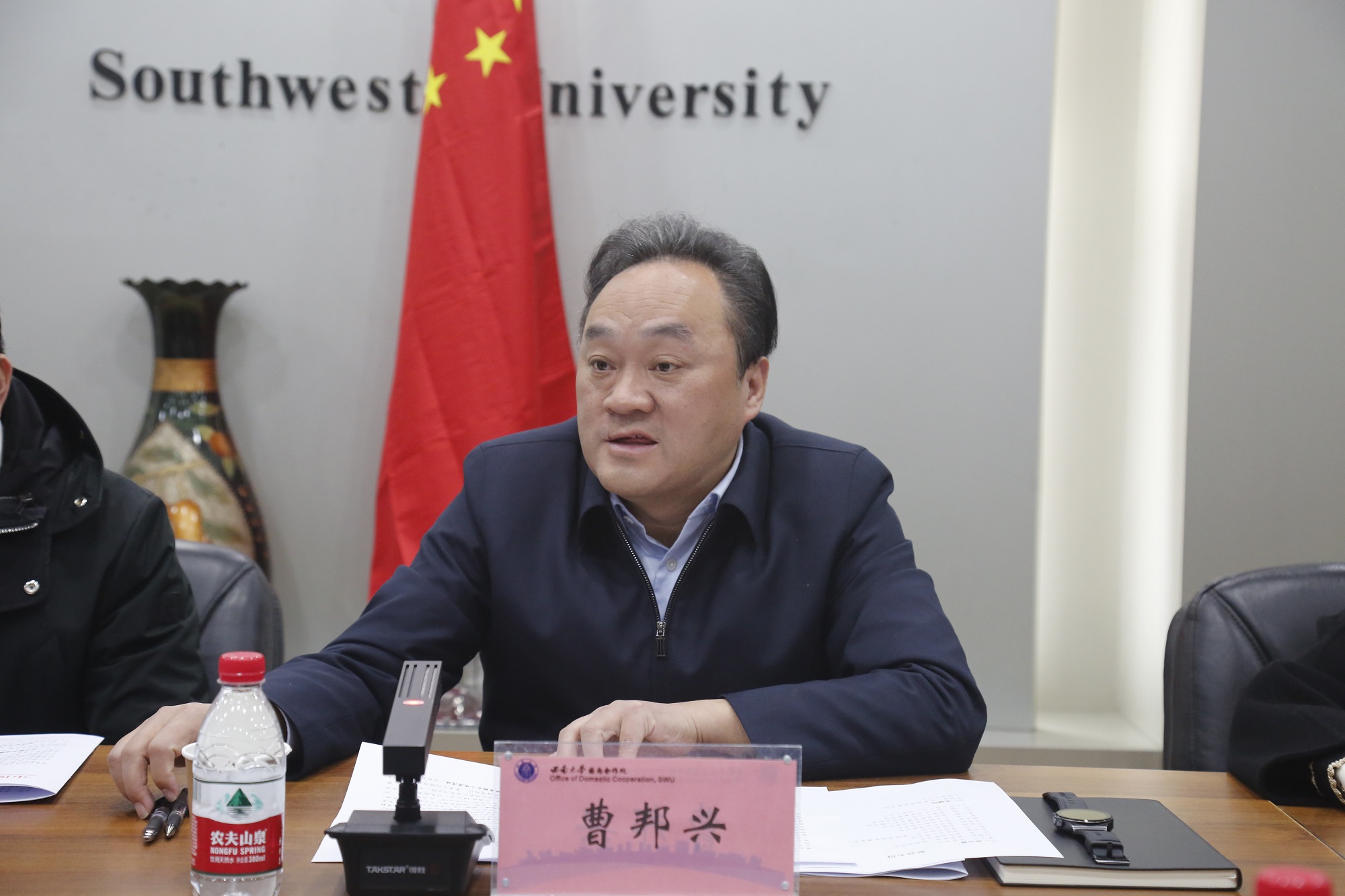 曹邦兴感谢学校多年来为巫山县经济社会发展给予的科技、人才支持。他表示,近年来巫山干部群众始终牢记习近平总书记的殷殷嘱托,重点抓好“两件大事”、打造“四张名片”,加快建设山区库区强县富民新巫山。希望与学校在乡村治理、乡村建设、乡村振兴创新示范,脆李、柑橘、核桃、蔬菜、中药材等山地特色农业发展,基础教育和心理健康教育提升,平台建设与文化旅游融合发展等方面加强合作,推动校地合作进一步提档升级、提质增效。