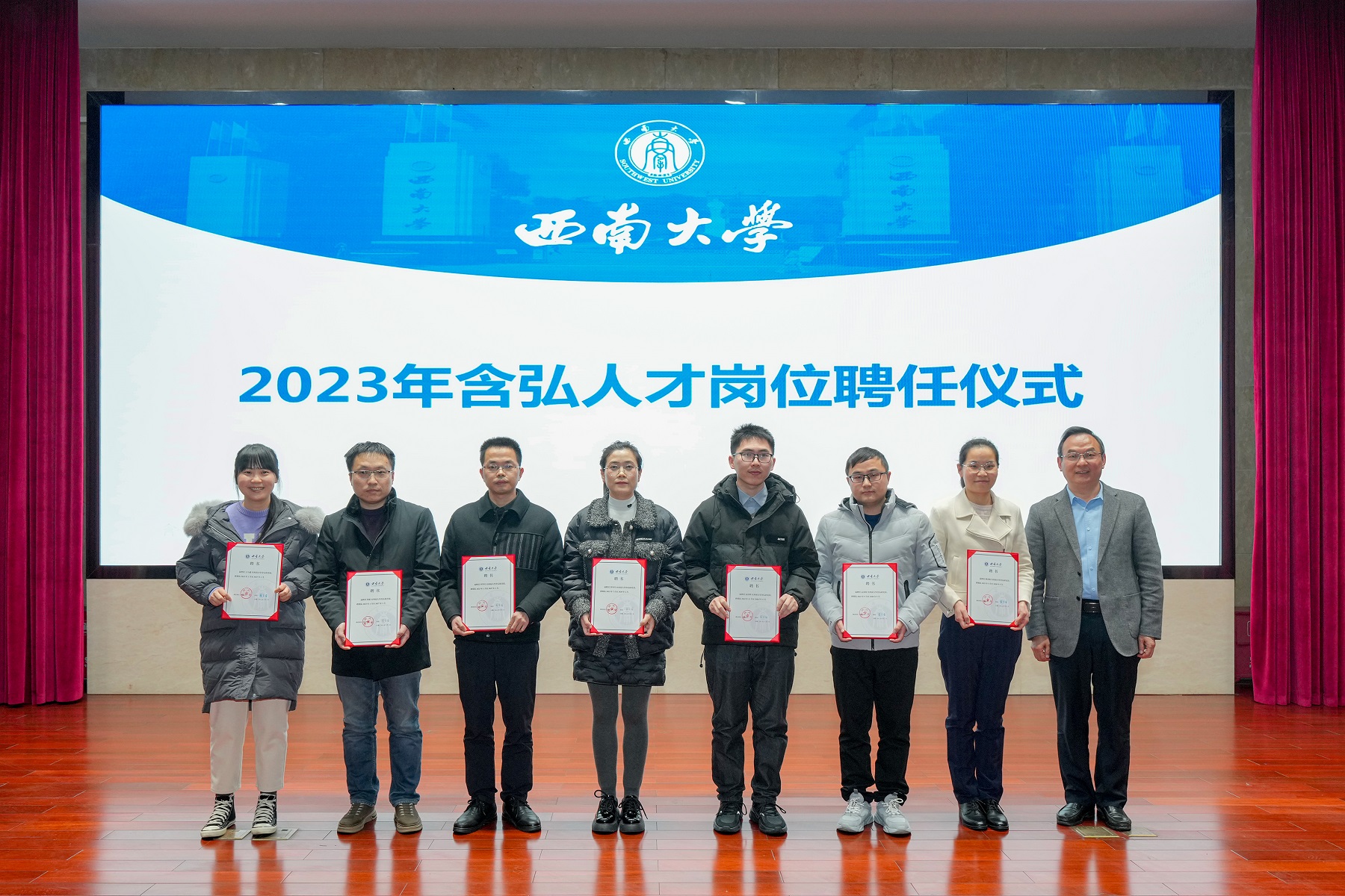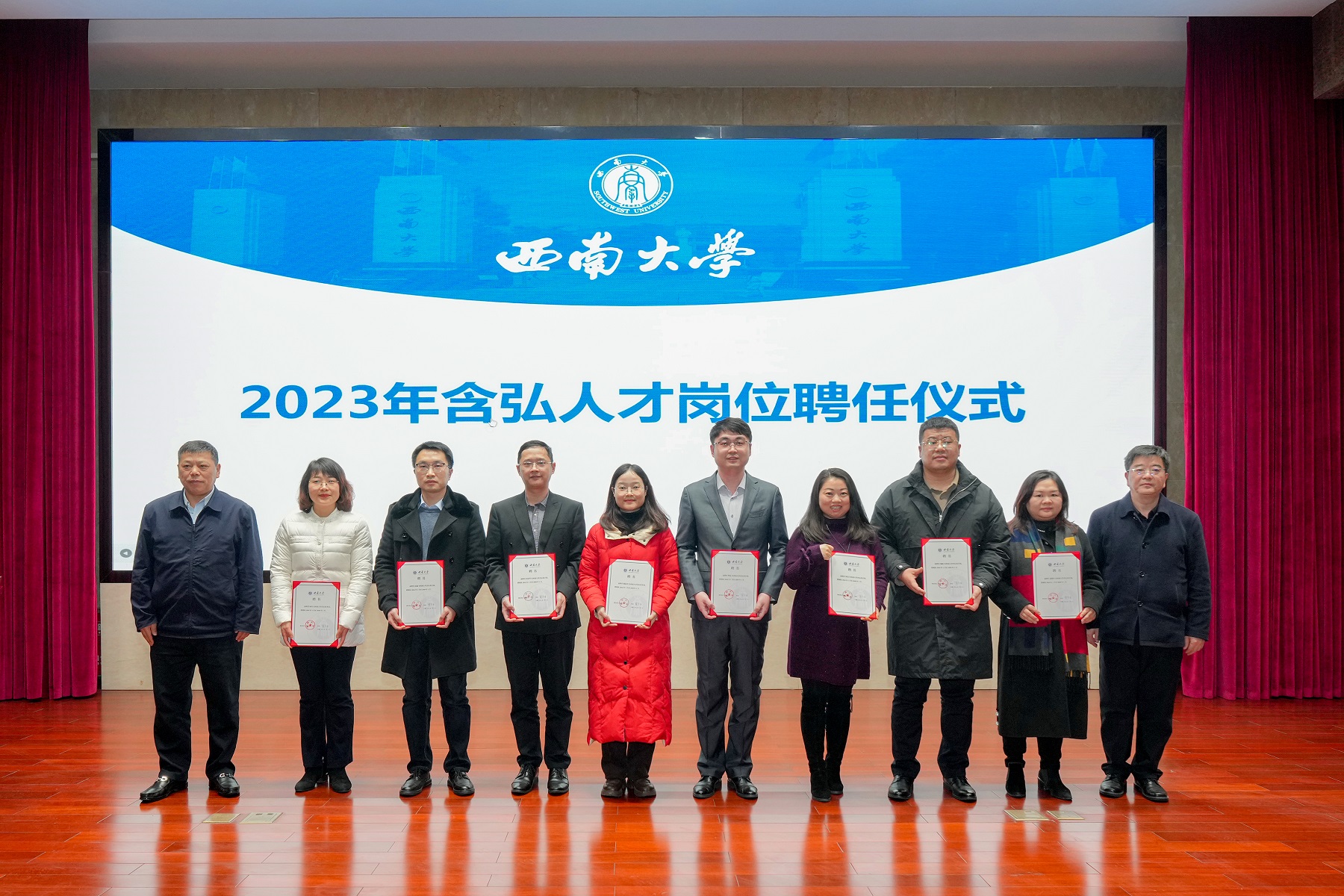 为充分发挥含弘岗位人才引领示范作用,促进以岗育才成效,推动学校高层次人才队伍建设。1月2日下午,学校在东方红会议厅举行了西南大学含弘人才岗位中期成果汇报展示会暨2023年含弘人才岗位聘任仪式。学校党委书记李旭锋,校长张卫国,党委副书记潘洵,副校长王进军、王志坚出席会议,相关职能部门负责人、部分二级单位负责人、含弘人才岗位代表以及师生代表等120余人参会。会议由潘洵主持。