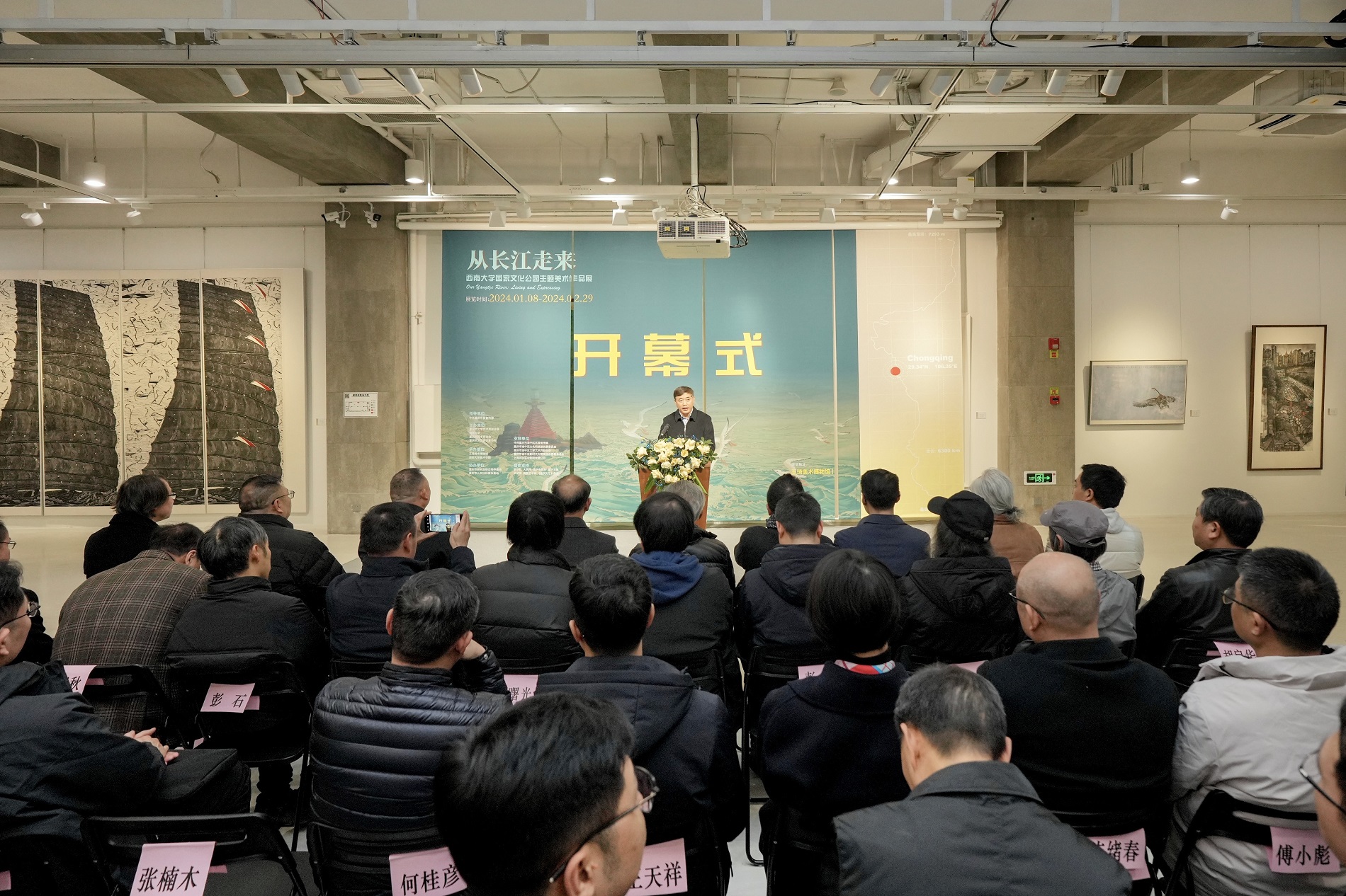 1月8日下午,“从长江走来——西南大学国家文化公园主题美术作品展”在王琦美术博物馆开幕。展览在市委宣传部的指导下,由市文联、西南大学、市美术家协会及市文艺评论家协会联合主办,王琦美术博物馆、学校美术学院承办,旨在进一步展示长江(重庆段)的文化资源和历史积淀,为新时代实施长江国家文化公园建设注入新活力,增强人民对长江文化的自豪感。市委宣传部、市文联、西南大学、市美术家协会、市文艺评论家协会相关领导,文艺界专家代表,川渝兄弟高校师生代表以及新闻界代表等共100余人参加开幕式。开幕式由美术学院党委书记张瑜主持。