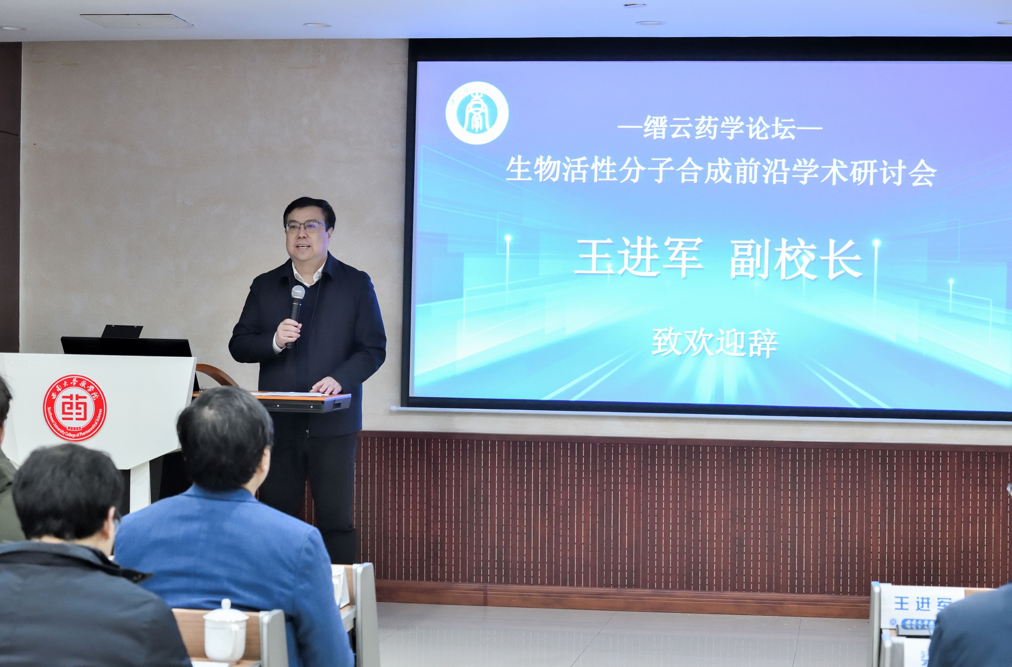 1月26至28日,药学院 中医药学院举办“缙云药学论坛—生物活性分子合成前沿学术研讨会”,四川大学副校长游劲松、西南大学副校长王进军出席会议。来自上海科技大学、北京大学、南开大学等多所高校的专家教授应邀参与研讨,西南大学教务处、科学技术处、药学院 中医药学院等单位有关负责人,市内高校相关领域师生150余人参加会议。