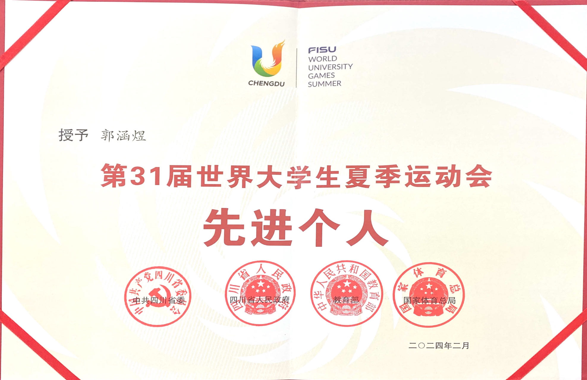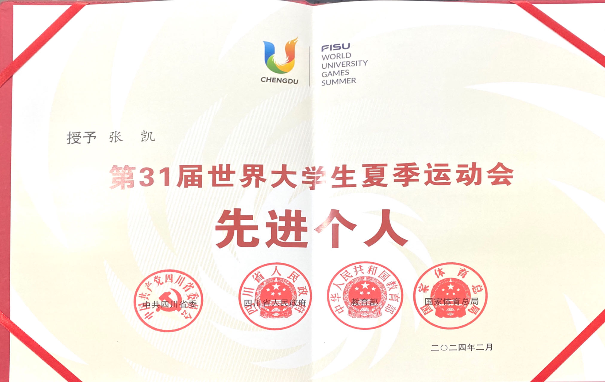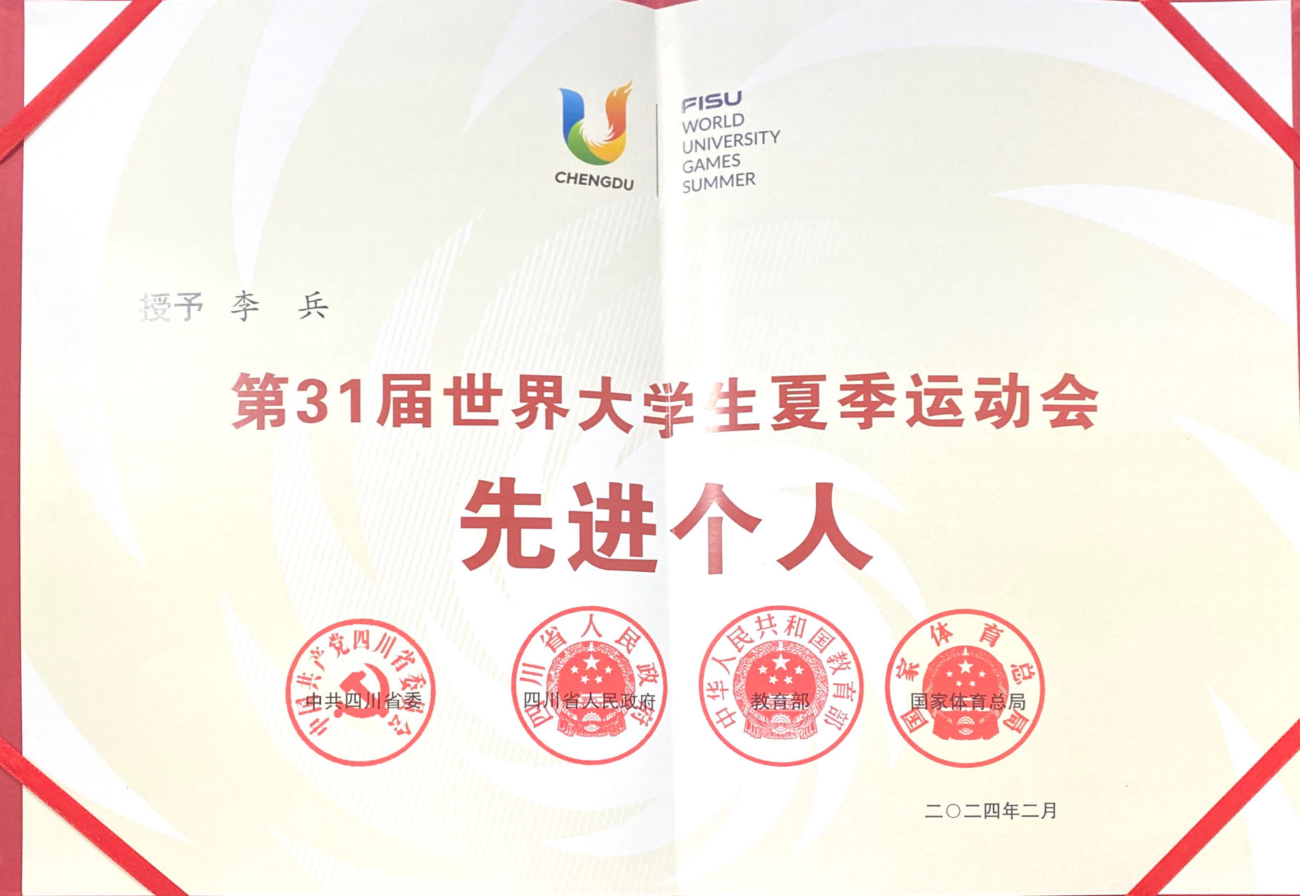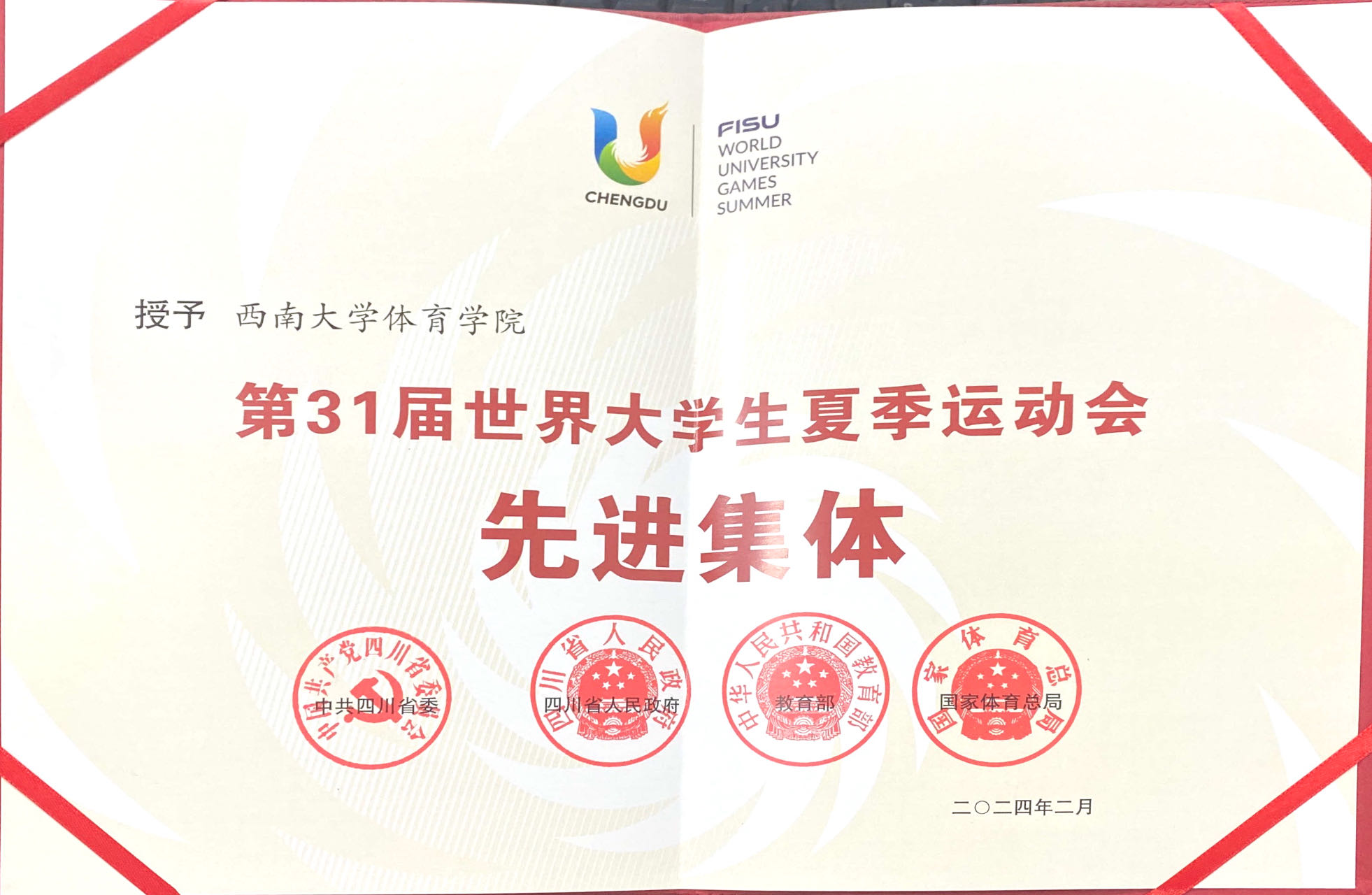 近日,中共四川省委、四川省人民政府、教育部、国家体育总局联合发布《关于表彰第31届世界大学生夏季运动会先进集体和先进个人的决定》,中国大学生体育代表团网球队、西南大学体育学院被授予“第31届世界大学生夏季运动会先进集体”称号,李兵、郭涵煜、张凯等3名师生被授予“第31届世界大学生夏季运动会先进个人”称号。