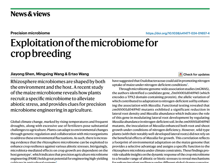 《自然-植物》期刊还专门为该文配发了评论文章,认为该成果对玉米根际微生物组的研究揭示了植物如何招募特定的微生物组来缓解非生物胁迫,为农业中的精准微生物组工程提供了线索。