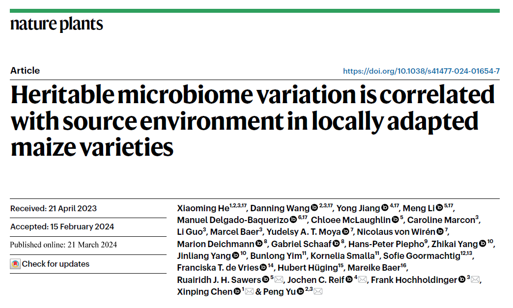3月21日,西南大学陈新平团队联合德国波恩大学等国内外多所高校在《自然-植物》(Nature Plants)期刊发表了题为“遗传性微生物组的变异与当地适应玉米品种的来源环境相关”(Heritable microbiome variation is correlated with source environment in locally adapted maize varieties)的论文,揭示了非生物胁迫下植物-微生物有益互作的遗传基础和环境调控机制。