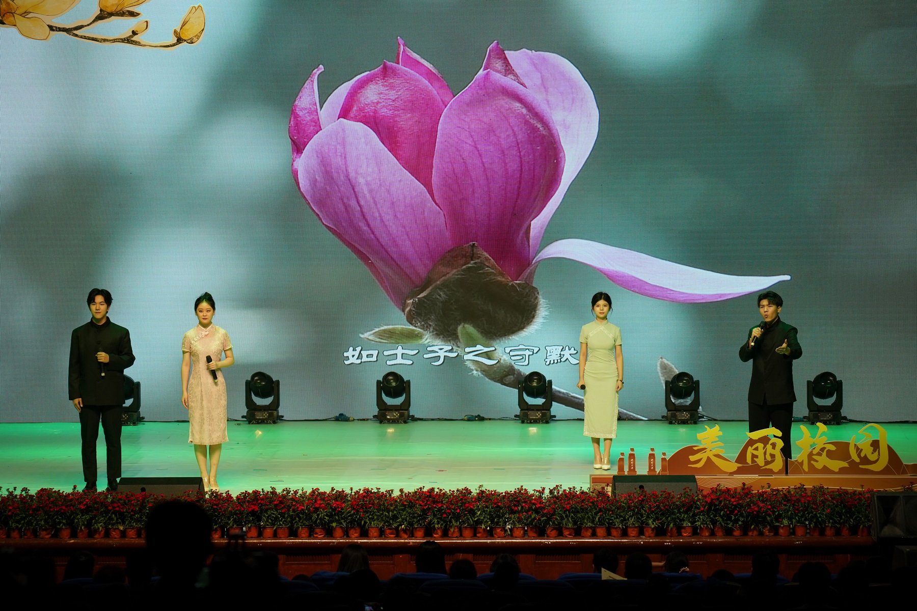 晚会中,学生们还诵读了歌颂校花玉兰的《玉兰赋》选段,幼儿园的小朋友还带来了舞蹈《可爱的蓝花楹》,音乐学院师生们配合情景讲述,带来了歌舞《嘉陵江上好风光》《太阳出来喜洋洋》《多情的土地》《我的深情为你守候》等节目,向观众们展示了西南大学校园文化建设的新成就和在助力乡村振兴的实践中所创造的“美丽风景”。