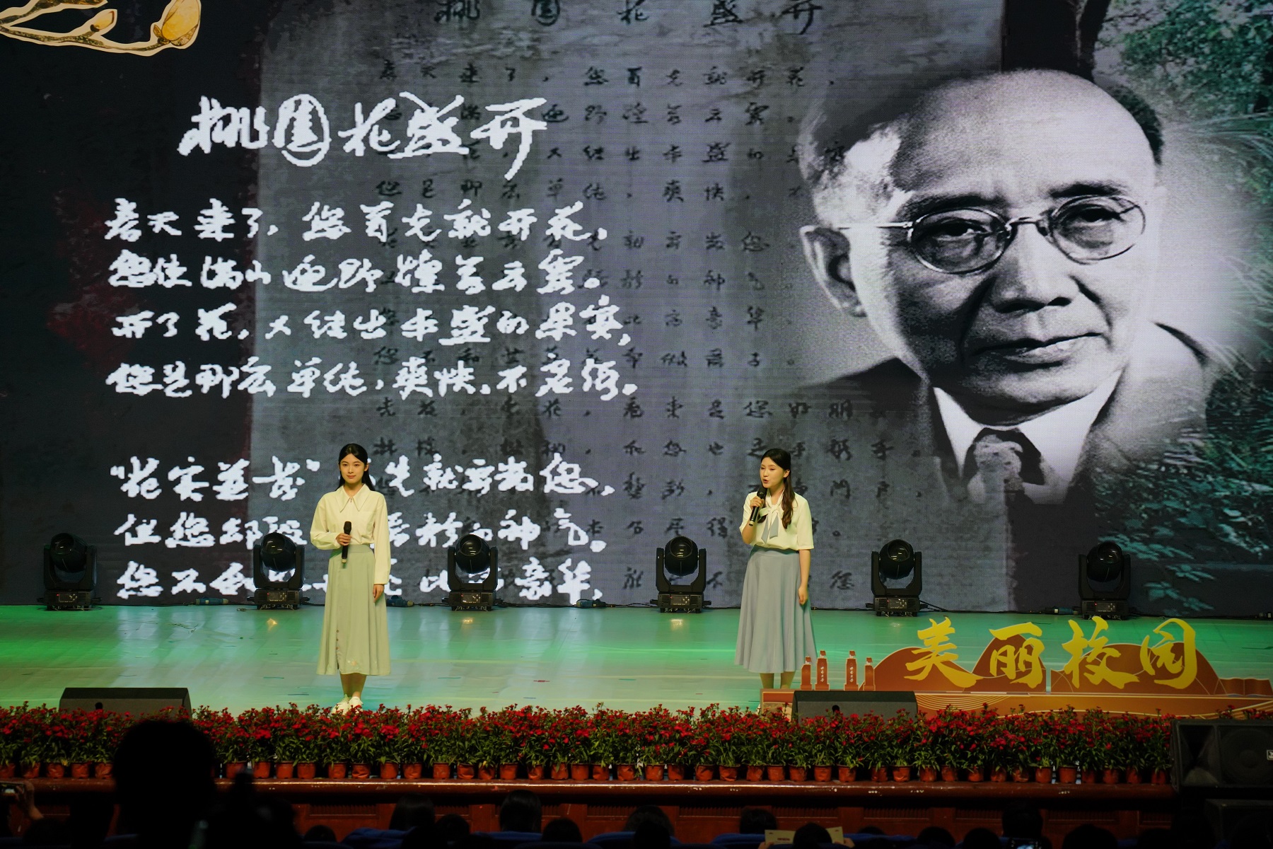 西南大学北区图书馆的小广场上,立着一块诗碑,上面是郭沫若的诗作《桃园花盛开》。晚会上展示的郭沫若手稿(复制件)揭开了这块诗碑的“来龙去脉”。