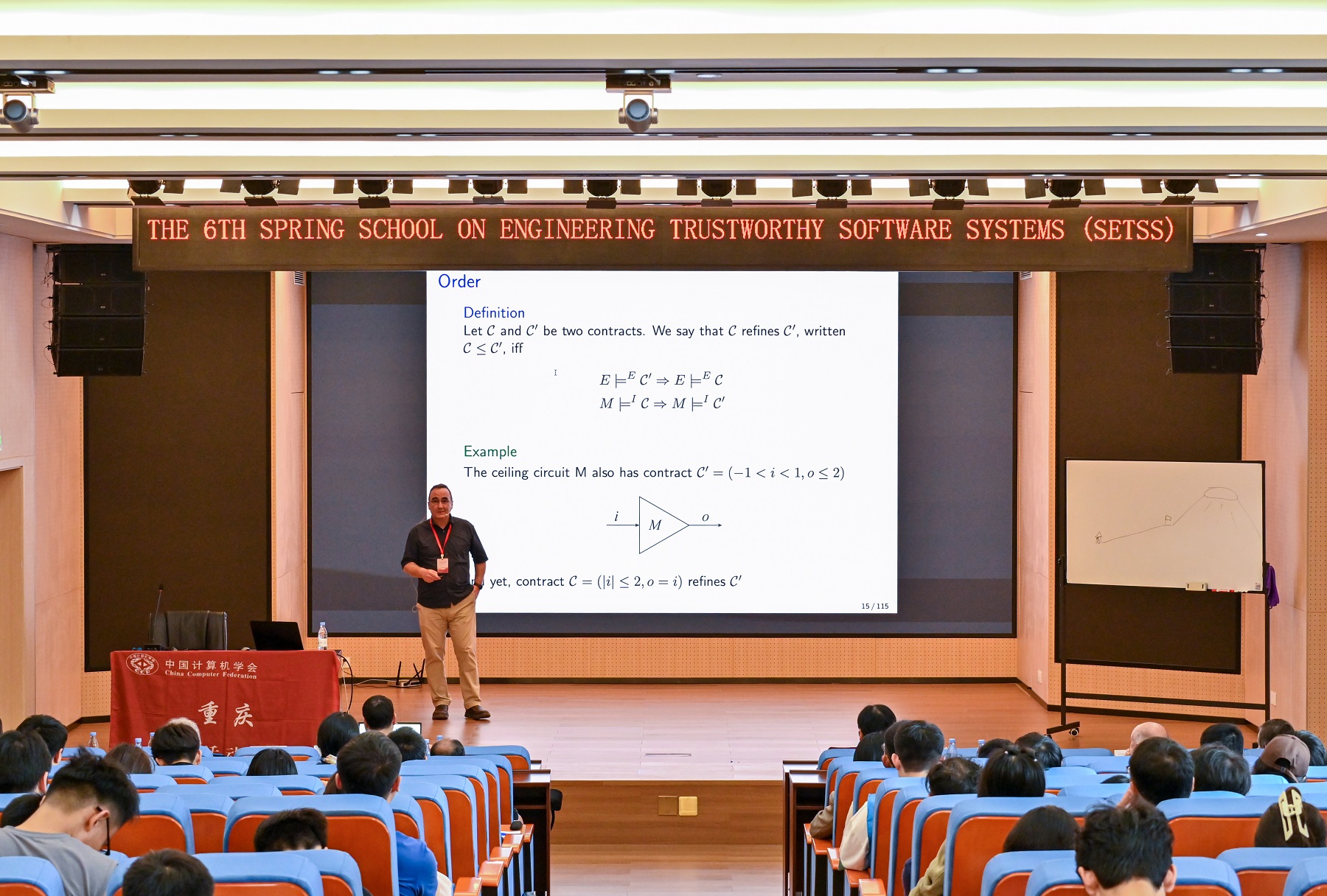 此次春季学校分为两个阶段:一是专题课程,为期五天,含十场报告;二是专题研讨会,为期两天,包括四场专题报告和七场论文报告。专题课程期间,西南大学刘志明教授、法国INRIA的Jean-Pierre Talpin、德国奥尔登堡大学的Martin Georg Fränzle、英国莱斯大学的Moshe Y. Vardi、英国曼彻斯特大学的Youcheng Sun、加拿大多伦多大学的Kuldeep Meel、丹麦奥胡斯大学的Cláudio Gomes等专家为学生授课。专题研讨会期间,来自中国科学院软件所、同济大学、国防科技大学、南京大学等高校、科研院所的师生和企业代表作了专题报告和论文报告。