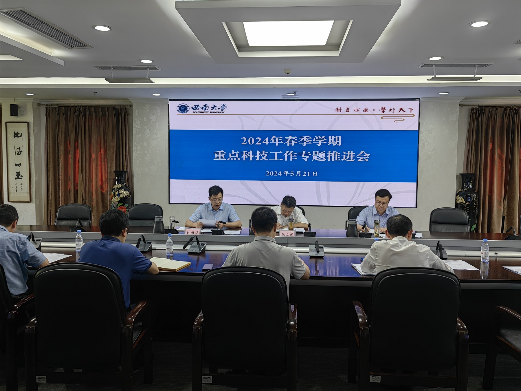 近日,学校召开2024年春季学期重点科技工作专题推进会。学校党委书记张卫国、校长王进军、副校长赵国华出席会议。科学技术处全体班子成员、科学中心相关负责人参加会议。