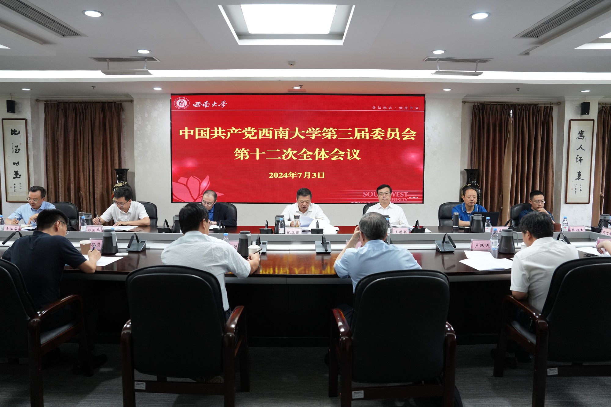 7月3日上午,中国共产党西南大学第三届委员会召开第十二次全体会议,全体在校校领导、党委委员出席会议。会议传达学习了6月27日中共中央政治局会议精神和习近平总书记在中共中央政治局第十五次集体学习时的重要讲话精神,听取和审议了党委书记张卫国代表党委常委会作的题为《牢记重托 勇担使命 为建设高水平研究型大学不懈奋斗》的工作报告,讨论了2024年秋季学期主要工作设想。