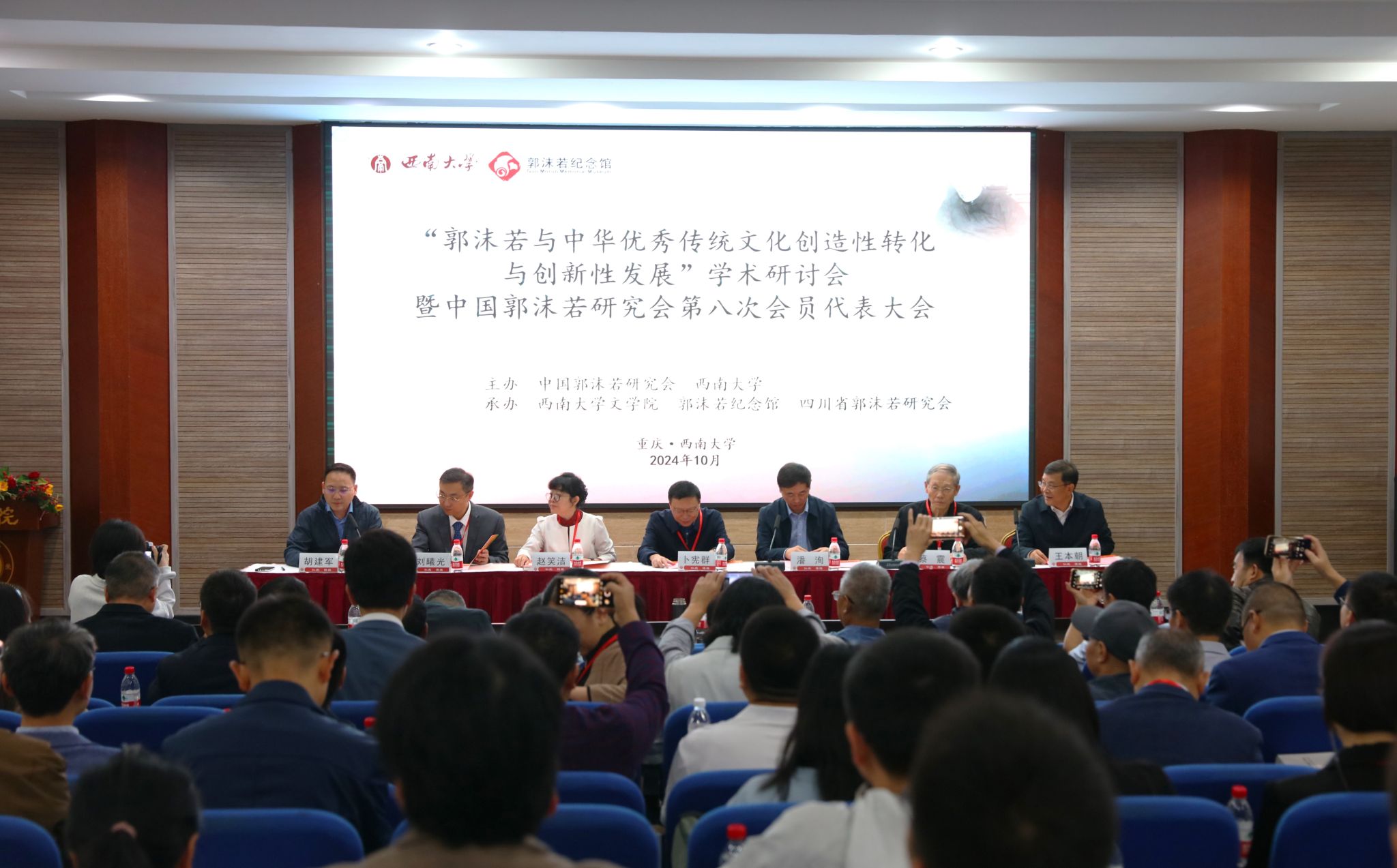 2024年10月19至20日,学校举办“郭沫若与中华优秀传统文化创造性转化与创新性发展”学术研讨会暨中国郭沫若研究会第八次会员代表大会。会议由中国郭沫若研究会、西南大学主办,西南大学文学院、郭沫若纪念馆、四川省郭沫若研究会承办。中国社会科学院古代史研究所所长、学部委员卜宪群研究员,中国社会科学院古代史研究所原党委书记赵笑洁,郭沫若纪念馆原副馆长、中国郭沫若研究会会长蔡震研究员,中国社会科学院郭沫若纪念馆副馆长(主持工作)刘曦光;学校党委副书记潘洵,文学院有关负责人出席开幕会。来自中国社会科学院、中国人民大学、北京师范大学、四川大学、武汉大学等30余所高校及科研院所的70余名专家学者参会。