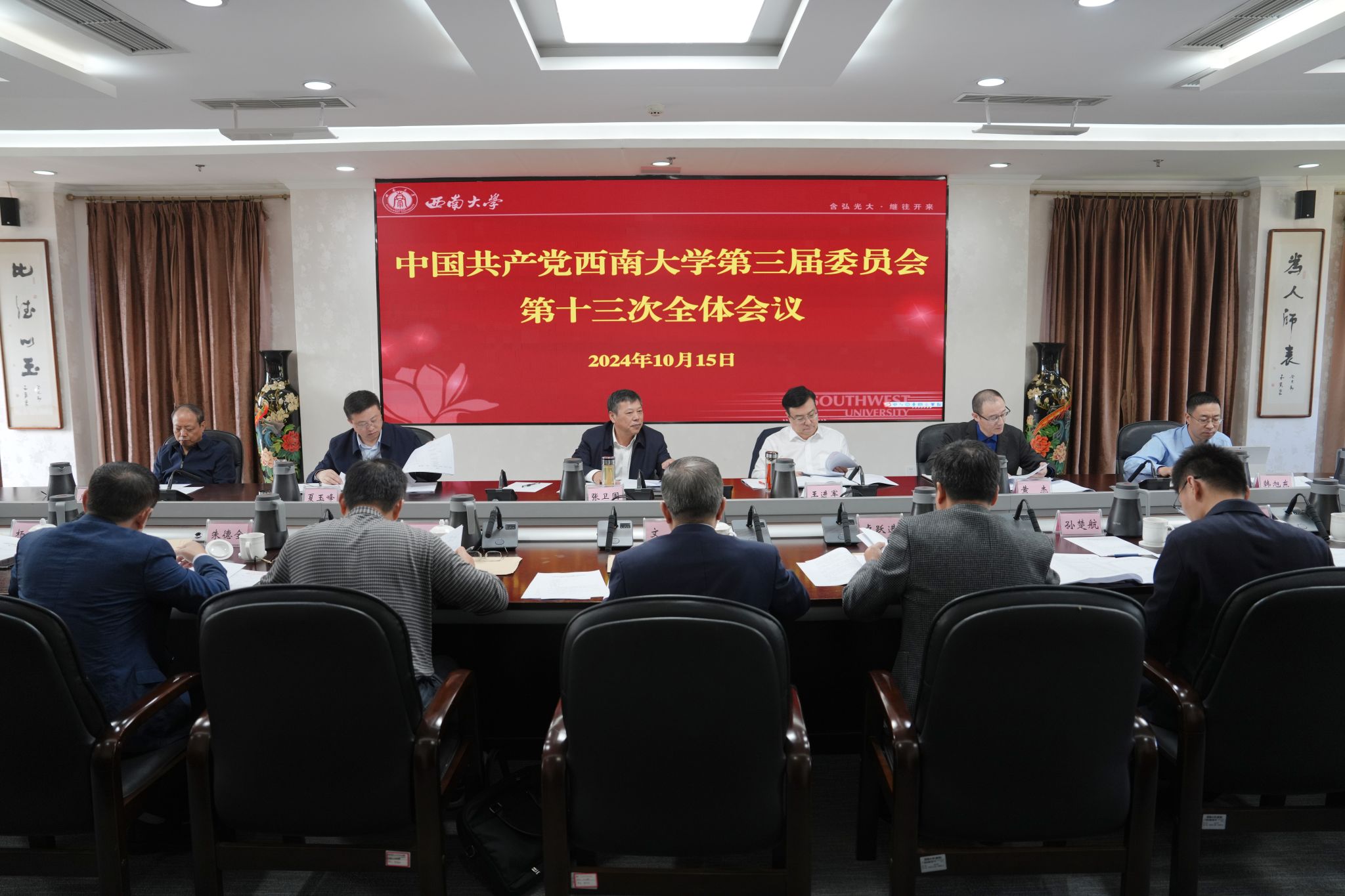 中共西南大学第三届委员会第十三次全体会议于10月15日上午在行署楼A栋第五会议室召开,全体在校校领导、党委委员参加会议,会议由党委书记张卫国主持。会议听取并审议通过了学校《深入贯彻落实党的二十届三中全会精神进一步深化综合改革工作方案》和巡视整改落实方案。