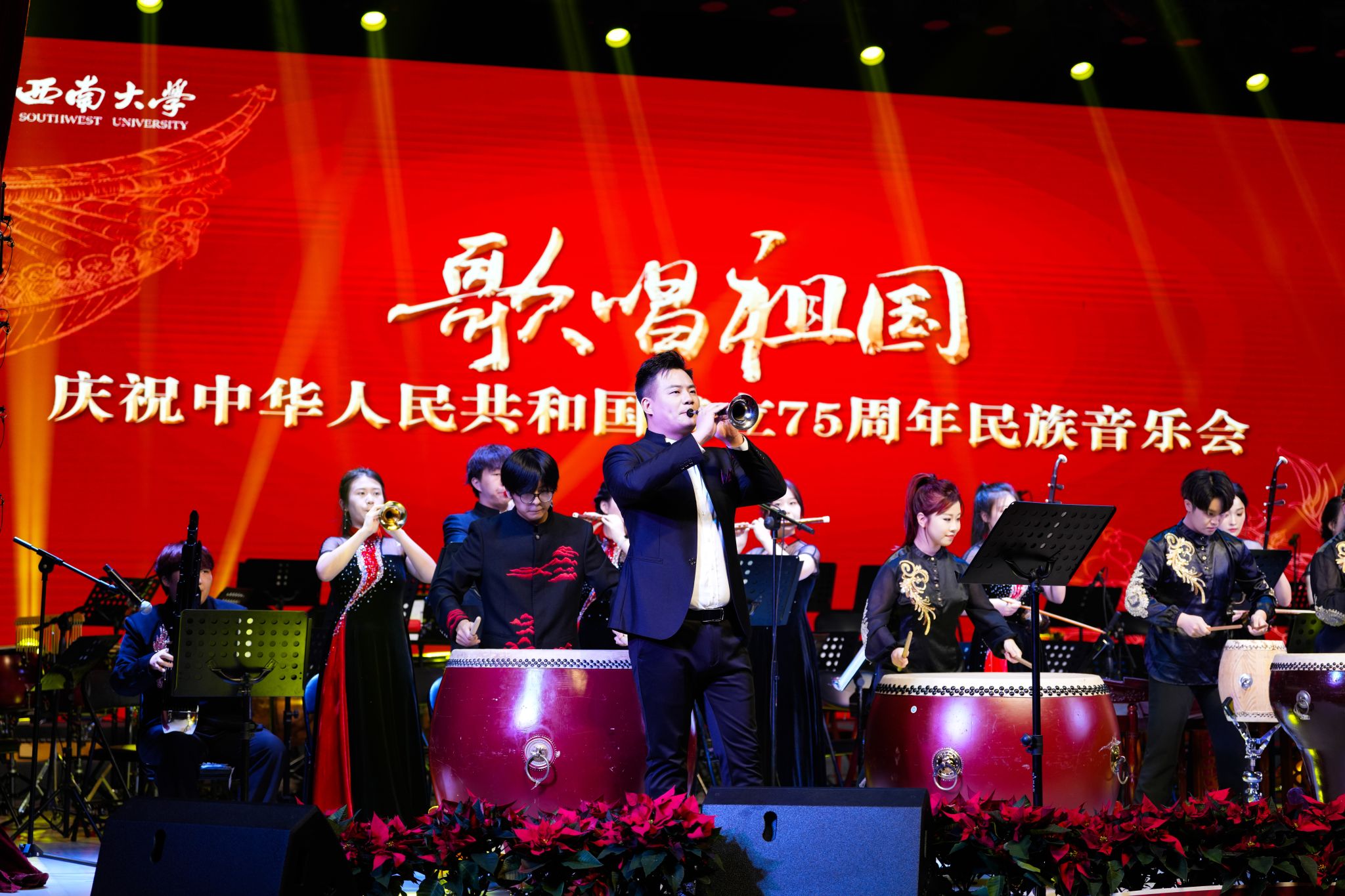 为庆祝中华人民共和国成立75周年,10月11日晚,学校在光大礼堂举办“歌唱祖国”庆祝中华人民共和国成立75周年民族音乐会。党委副书记黄杰、相关职能部门负责人出席音乐会,近千名师生代表到场观摩聆听。音乐会以民族管弦乐合奏、器乐独奏、民族声乐演唱等多种形式呈现,用音乐向祖国献上深情祝福。