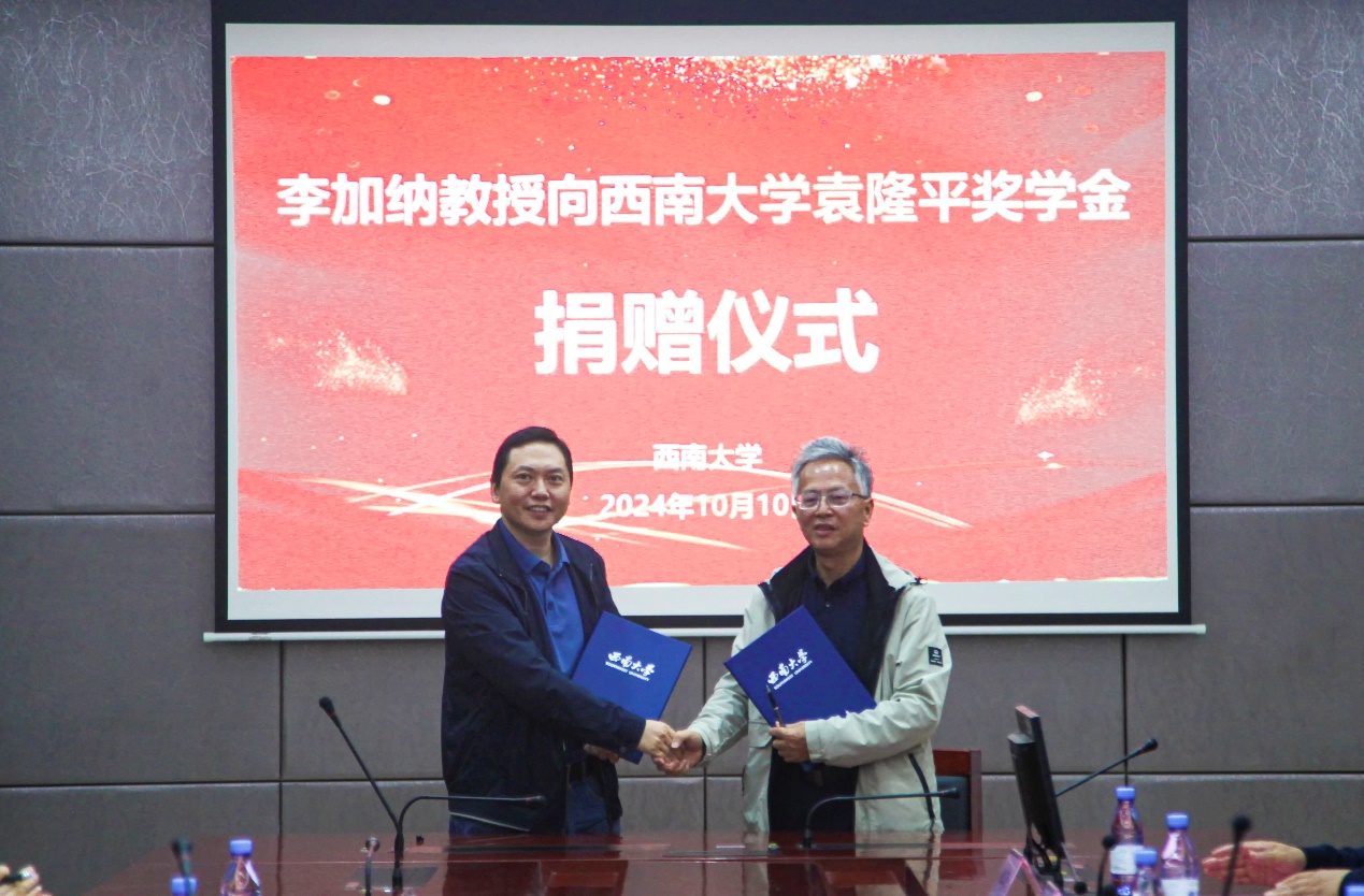 10月10日上午,李加纳教授向西南大学袁隆平奖学金捐赠仪式在隆平楼举行。副校长葛信勇、李加纳教授出席仪式,农学与生物科技学院领导班子全体成员及师生代表、学校教育基金会负责人参加仪式。仪式由农学与生物科技学院党委书记阳义健主持。