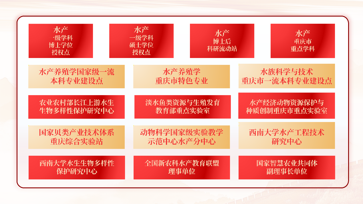 学科牵引,引领发展方向。现设水产养殖学(国家级一流专业)、水族科学与技术(重庆市一流专业)2个本科专业,拥有水产一级学科硕士、博士点及博士后科研流动站,是重庆市重点学科和西南大学“生物学”双一流学科支撑单位,是西部地区水产高等教育和科研的核心阵地,是农业农村部长江上游水生生物多样性保护研究中心的核心依托单位。
