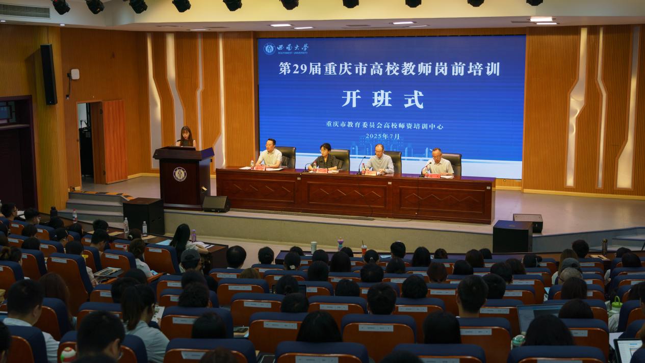 7月14日上午,“第29届重庆市高校教师岗前培训”开班式在学校举行。重庆市委教育工委委员、市教委副主任金玲,市教委人事处处长李斌,学校党委副书记黄杰出席,来自全市76所高校的5078名新入职教师通过“线上+线下”方式同步参加。开班式由继续教育学院院长程龙主持。