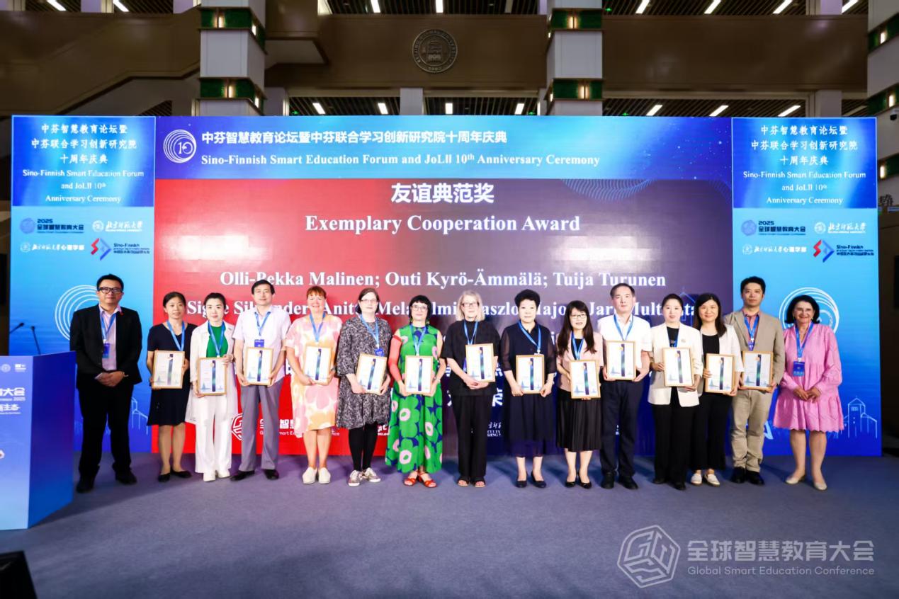 期间,赵玉芳应邀参加大会平行会议“中芬智慧教育论坛暨中芬联合学习创新研究院十周年庆典”。据悉,中芬联合学习创新研究院于2015年建立,北京师范大学为中国高校牵头单位,西南大学为中国理事单位之一。论坛聚焦中芬两国专家创新教育合作成果,基于人工智能前沿技术,为全球教育发展提供新思路和新方案。在中芬联合学习创新研究院十周年庆典环节,赵玉芳代表学校领受“友谊典范奖”,并为“科研合作奖”获得者颁奖。