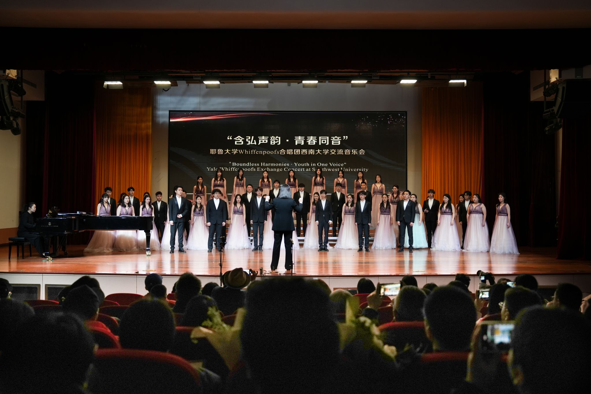 3月19日,“含弘声韵·青春同音”耶鲁大学Whiffenpoofs合唱团西南大学交流音乐会在学校大演奏厅精彩上演。来自美国耶鲁大学的Whiffenpoofs合唱团携手学校音乐学院合唱团、交响乐团联袂献艺,以歌声架起中外青年交流的桥梁。副校长赵玉芳出席活动,学校相关职能部门负责人、师生代表及北京大鸾翔宇慈善基金会代表到场观看演出。