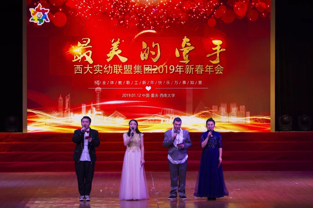 1月12日,西南大学实验幼儿园举办“最美的牵手”西大实幼联盟集团2019新春年会,23所姊妹园联合为新春送上祝福。北碚区教委副主任饶英、重庆市教育科学研究院学前教育中心主任徐宇、北碚区教师进修学院副院长黄吉元、北碚区教师进修学院学前教研员周霞莅临现场,同时到会的还有西大实幼退休教职工,及西大实幼全体教师。