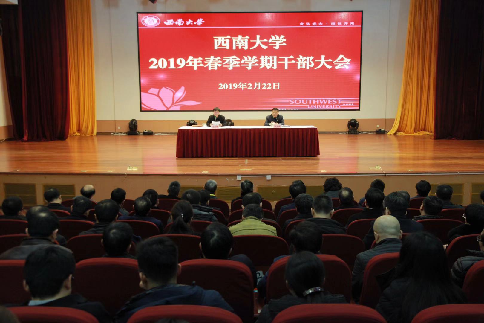 党委书记李旭锋作了“担当作为 狠抓落实 着力书写改革发展的奋进之笔”的主题讲话。李书记在讲话指出,2019年是新中国成立70周年,是全面贯彻落实党的十九大精神和以习近平同志为核心的党中央决策部署,全面建成小康社会、实现第一个百年奋斗目标的关键之年;是教育系统深入实施“奋进之笔”,贯彻落实全国教育大会精神的开局之年;是西南大学改革发展迈入新阶段,攻坚克难、狠抓落实,交出“得意之作”的重要一年。在2019年全国教育工作会议上,陈宝生部长强调“落实、落实、再落实”,把今年确定为攻坚克难、狠抓落实之年。按照部党组的统一部署,学校的广大干部教师就必须担当作为、狠抓落实,这是2019年学校工作的主旋律。我们要通过全校干部教师的新担当新作为,为学校实现新发展新跨越开好局、起好步。