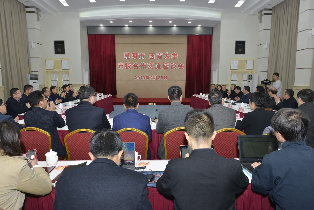 双方在桂园宾馆金桂厅召开座谈会,昆明市委书记程连元、市委副书记刘智、市委秘书长夏俊松、市政府副市长胡宝国、副市长赵学农、政协副主席刘绍安,西南大学党委书记李旭锋、校长张卫国、党委副书记安春元、副校长崔延强、原副校长丁忠民等出席会议。会议由张卫国校长主持。