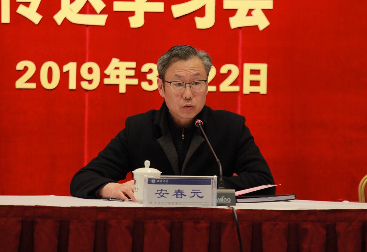 李书记要求,要在学习贯彻上做文章,筑牢西南大学的奋进之魂。学习贯彻全国两会精神,是当前学校政治生活中的一件大事。今天的会议既是传达学习会,也是工作部署会,拉开了全校学习贯彻全国两会精神的序幕。要把学习贯彻全国两会精神与习近平新时代中国特色社会主义思想和党的十九大精神相结合,与习近平总书记关于教育工作的重要论述相结合,融会贯通、一体贯彻,全方位、多层次、立体化地推进全国两会精神的学习贯彻,推动全国两会精神在西大校园落地生根。