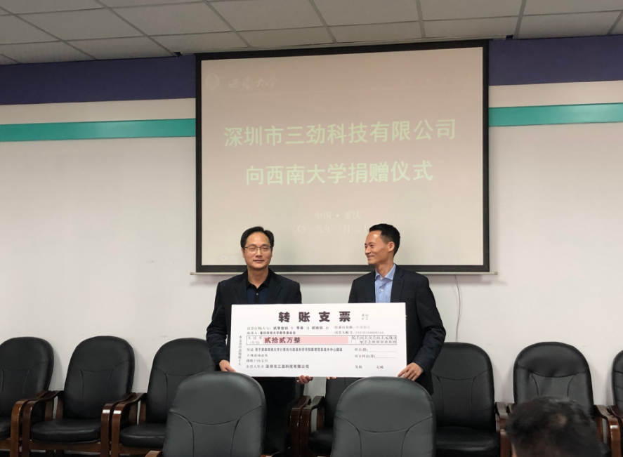 李庆康总裁是深圳市三劲科技有限公司创始人,原西南师范大学外语系91届校友,曾任西南大学深圳市校友会会长。李总裁一直心系母校,在校友工作、校企合作等方面作出了贡献,此次捐赠既表达了他对母校的深情厚谊,也将双方的合作推向更高的台阶。