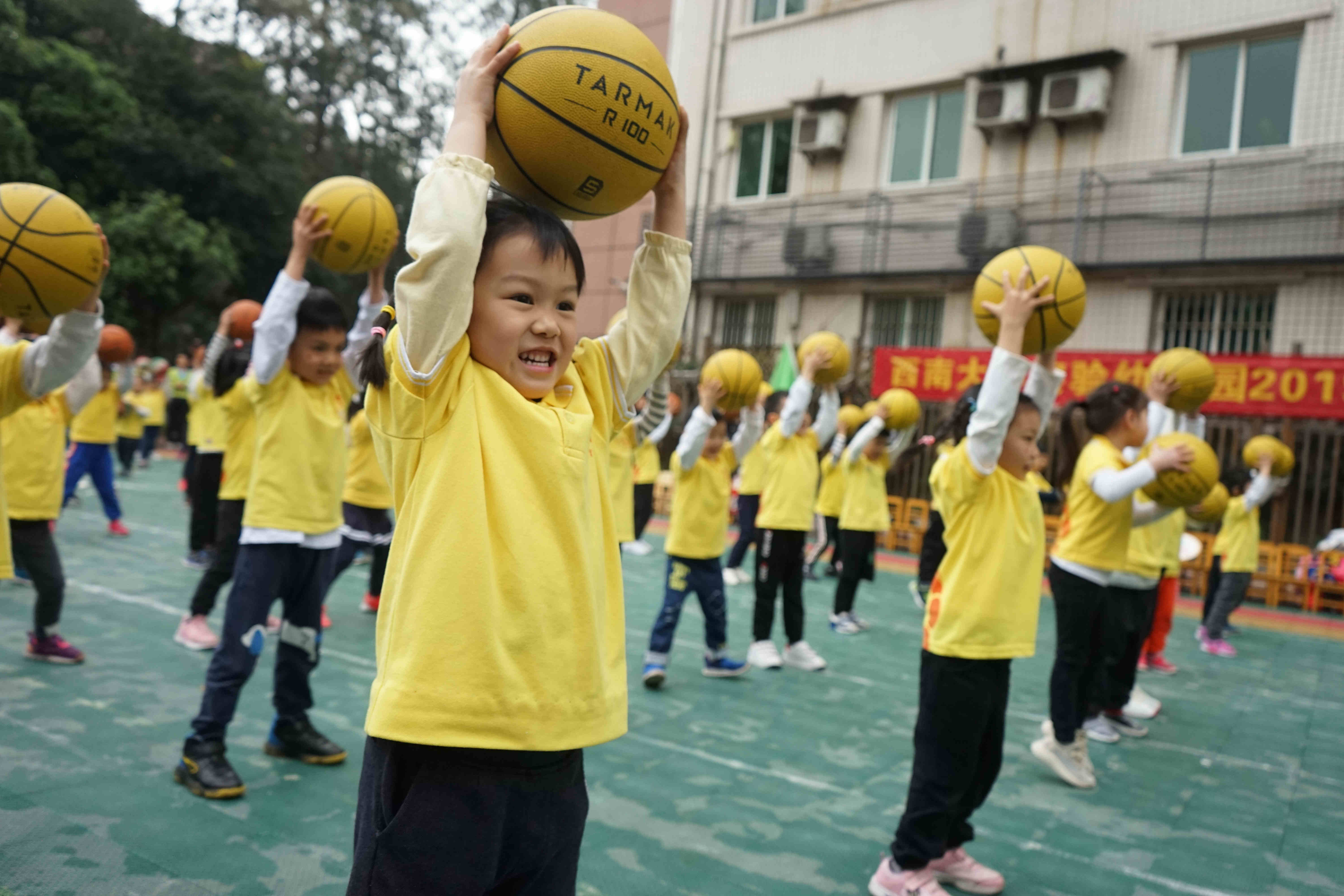 运动会开始,来自三个年级组的小朋友在整齐的入场式后进行了篮球操表演。篮球操是实验幼儿园的传统亮点项目,一直得到家长们的广泛好评。随后,大班年级组以“快乐的民间游戏”为主题,家长与孩子们一起在跳房子、双人跳绳、集体划龙舟等项目中感受传统游戏的乐趣,获得亲子运动的愉快;中班年级以“快乐的球类运动”为主题,丰富球的多样玩法,感受合作运动的快乐;小班孩子与家长一起围绕身体基本动作跑、跳、钻、爬为主要内容,在亲子配合中感受运动的快乐,培养孩子们热爱运动,积极参与体育锻炼。