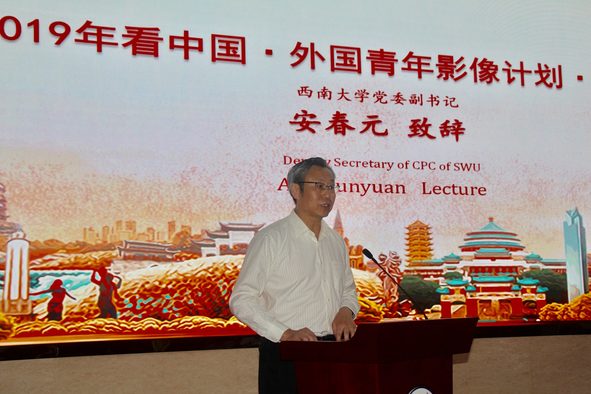 仪式伊始,安春元书记代表学校向来宾们表示欢迎。安书记指出,学校是教育部直属,教育部、农业农村部、重庆市共建的重点综合大学,是国家“双一流”建设高校,他希望通过“看中国·外国青年影像计划”项目的实施增进中国青年和其他国家青年的友谊,互学互鉴,共创美好未来。安书记预祝2019“看中国•外国青年影像计划重庆行”取得圆满成功。