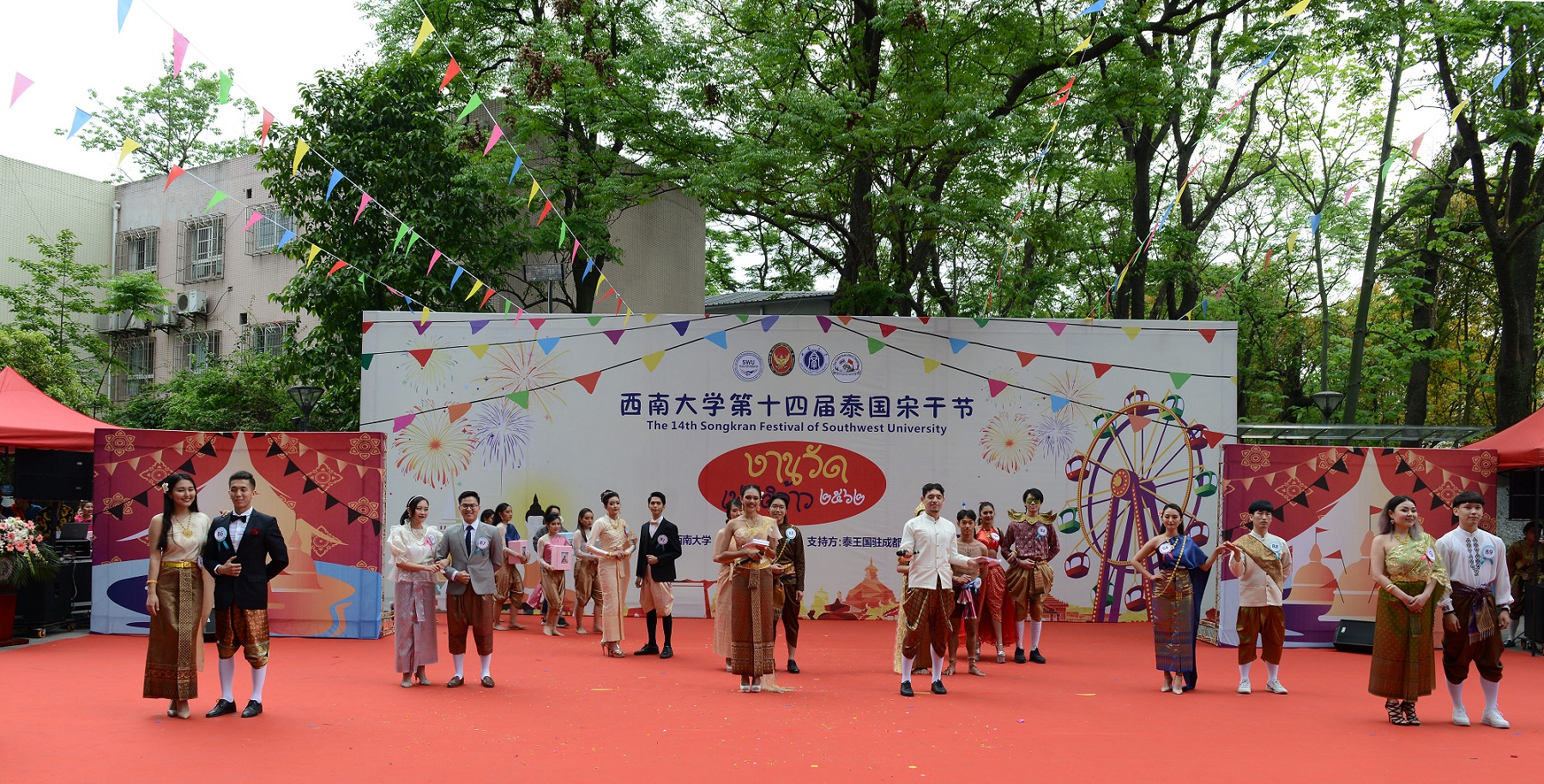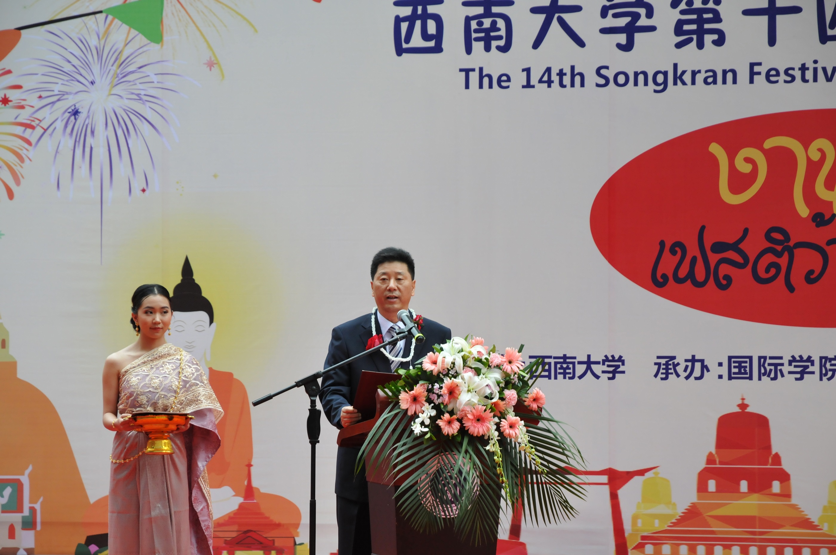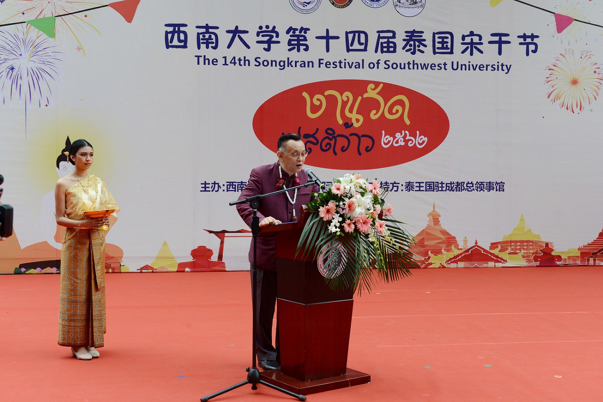 4月10日下午,学校第十四届泰国宋干节举行。泰王国驻成都总领事馆总领事吴威德、重庆市公安局出入境管理局和北碚公安分局的有关领导、学校副校长靳玉乐,以及学校相关职能部门负责人应邀出席本次活动。中外师生500余人共同欢度泰历新年。