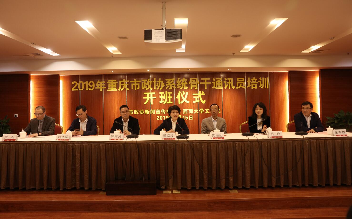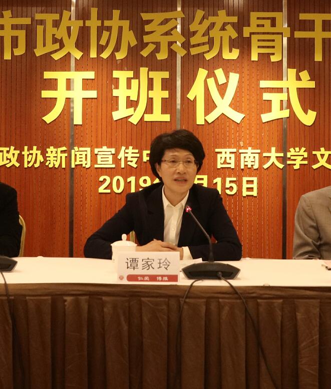 4月15日,2019年重庆市政协系统骨干通讯员培训在学校开班,重庆市政协副主席谭家玲,西南大学副校长陈时见,北碚区政协主席周继超,重庆市政协研究室副主任吕玲,西南大学文学院党委书记黄杰、院长王本朝,重庆市政协新闻宣传中心副主任彭世祥出席开班仪式。开班仪式由吕玲副主任主持,来自重庆市政协新闻宣传中心及各区县政协新闻部门负责人130余人参加开班仪式。